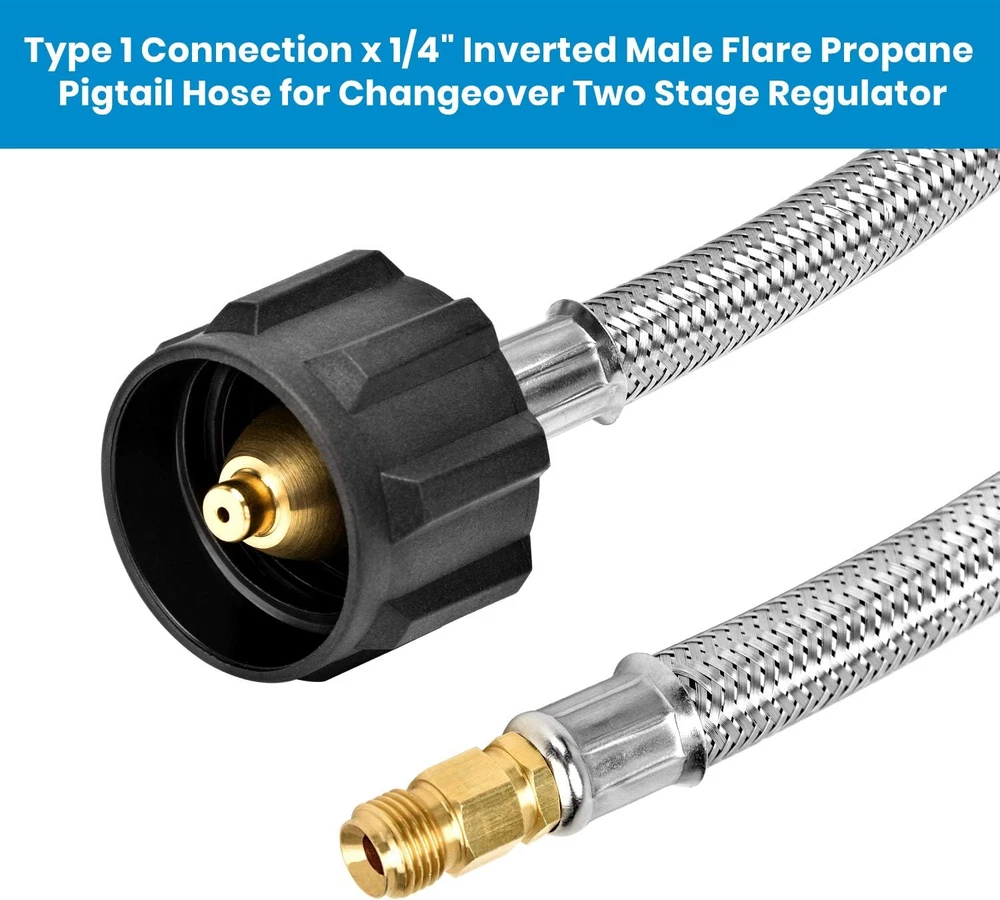 Store New Arrivals Add to Favorite View Feedback Contact Stanbroil 2PCS 12" RV Stainless Steel Braided Propane Pigtail Hose for 2-Stage Description Item model number C014-12-SS Part Number C014-12-SS Batteries Required? No Color Gold, Silver, Black Brand Stanbroil Material Stainless Steel Item Weight 13 ounces Shape Round Batteries Included? No Item Length 12 Inches Size 12" Propane Hose Package Dimensions 8.03 x 5.16 x 3.11 inches Manufacturer Stanbroil Package include: 2pcs, ACME nut x 1/4" male Inverted flare,12" stainless steel RV propane hose. Rated for: 200,000 BTUs per hour, high quality brass fittings for safety and tightness. Feathers: Stainless Steel Braided Hose protect from damage and extend service life. The pigtail hose can also be used to connect to an installed 4-Port Tee as an auxiliary propane supply. Designed to connect: Camper's 1/4" inverted flare inlet 2-stage auto changeover regulator to a QCC1 5lb-40lb LP tanks. Package Include: 2-Pack: 12"stainless steel braided RV propane hose Specifications: - High quality solid brass fittings-provides secure, airtight connection propane equipments - Installs quickly and easily tool-less attachment to propane tanks and regulator. - It Provides thermal protection and excess flow protection Perfect for: Perfects for BBQ, RV and camping needs or having an outdoor cookout. Warm Tips:: 1/4" male inverted flare is not 1/4'' Male NPT. Please check your connector before you order. ABOUT US We offer the best prices around on high quality products. Our E-store includes media such as books, movies, music and games while offering electronics, toys, sporting apparel, clothing, tools, general home, garden items and more. SHIPPING We are always working hard to ensure your package arrives as soon as possible. Please understand that some factors like weather, high postal traffic, and the performance of shipping companies are outside of our control. We offer free shipping to the lower 48 states and ship within 2 business days of payment, usually sooner. We do not accept P.O. Boxes. Please provide a physical address. RETURNS We offer a 30-Day Return Policy on items which you are not completely satisfied with. You have the option for a full-refund or an exchange of the item. No returns are available on items shipped outside of the USA. PAYMENT We accept PayPal. CONTACT US This page content is yet to come Please ad us to your favorite seller and visit again later Thank You CUSTOMER SATISFACTION We try our very best to make sure every customer is completely satisfied. If there's a problem, message us! We're happy to help.