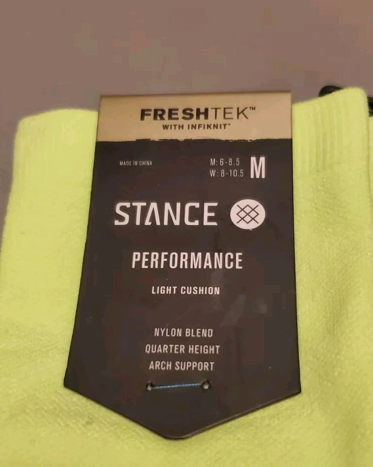 Elevate your sock game with these Stance Run Light Quarter Ankle Socks in Volt Blue. Designed for performance, these socks feature arch support, cushioning, and moisture-wicking technology to keep your feet comfortable and dry during any activity. The mid-calf length and lightweight construction make them perfect for all seasons, whether you're hitting the gym, going for a run, or just running errands. Made from a blend of polyester, nylon, combed cotton, and elastane, these socks are machine washable and easy to care for. They come in a size medium (6-8.5) and are perfect for men who want to add a touch of style to their wardrobe. With their solid pattern and green color, these socks are versatile enough to wear with any outfit. Pictures are of actual socks. Brand new never worn and no defects. Feel free to contact me with any questions.
