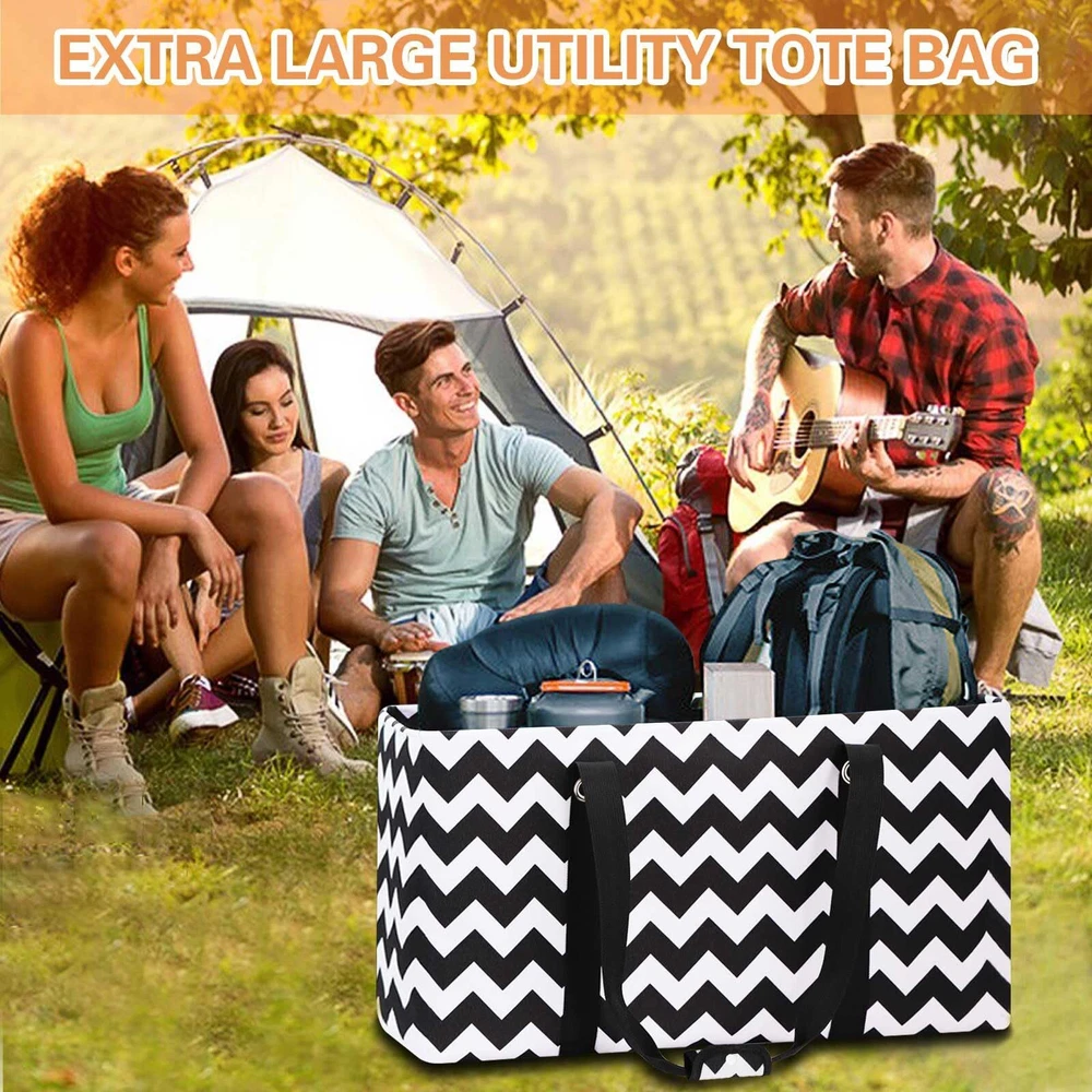 【Stand Up Design & Personalized Pattern】The bottom of the utility tote bag is designed with a removable folding bottom plate and a thick metal wire frame for the top opening, which makes the structure of the entire reusable grocery bags more stable. This design ensures that the reusable shopping bags can stand well without any load. The unique graphic style adds beauty to the large utility tote bag, making it more stylish for grocery, shopping, picnics, beach, travel and car trunk storage. 【Up to 50lbs Load-bearing】This extra large utility tote bag are made of thick Oxford-800D PVC coated cationic fabric on the outer layer and nylon on the inner layer. The sturdy and thick water-proof fabric makes it solid and durable. The handle webbing is reinforced with a metal buckle, ensuring the extra large tote bag can withstand a weight of 50 pounds. Our handles are also designed with a soft padding to provide extra support when carrying large utility tote, making carry more comfort. 【Extra Large Utility Tote】The extra large utility tote bag measures: 22.5" L x 10.5" W x 12" H, has a 46 liter capacity and holds 18 bottles (1.25 liters). The extra large utility tote provides ample space to hold a lot of daily necessities such as groceries, vegetables, fruits, bottles and jars, shoes and clothes, etc. Use this utility tote bag for shopping, which will stop the waste of single-use plastic bags. 【Inner Bag & Foldable Design】Our beach bag is designed with a small zippered pocket inside, where you can some small daily items, such as mobile phones, keys, cards, wallets, etc. This large beach bag can be folded up and stored when not in use, without taking up too much space. If the utility tote is stained, please clean it with a damp cloth and let it air dry. 【Multi-purpose Utility Tote】Utility tote bag can be used for more than just grocery runs, the large and roomy interior makes them perfect for supermarkets, grocery stores, picnics, beaches, fitness, camping, home sports, organize laundry, organize toys, organize car trunks or organize cleaning supplies.