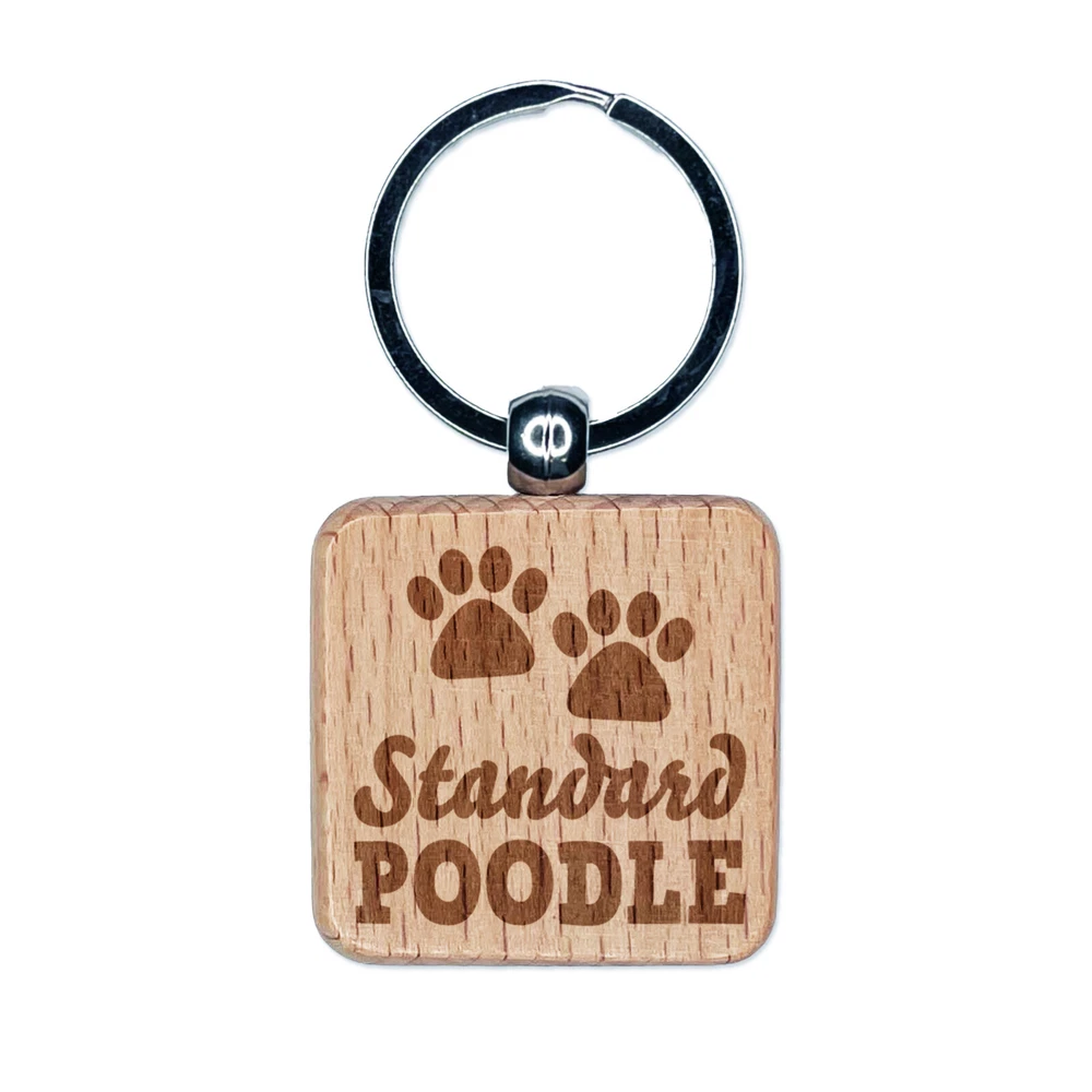 Standard Poodle Dog Paw Prints Fun Text Engraved Wood Square Keychain Tag Charm