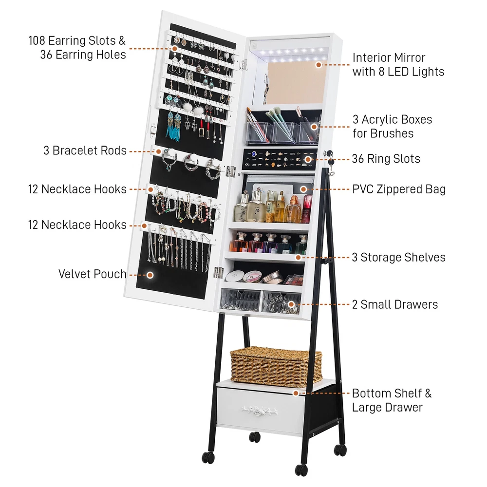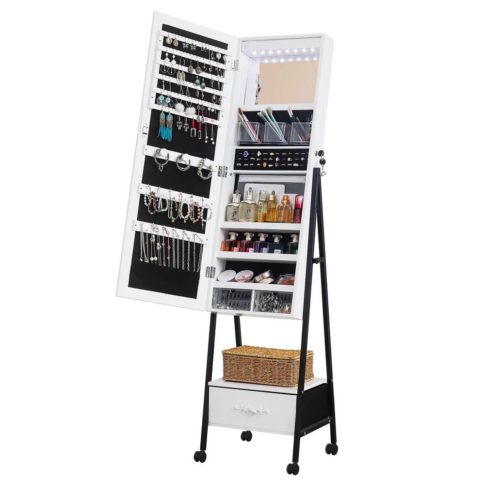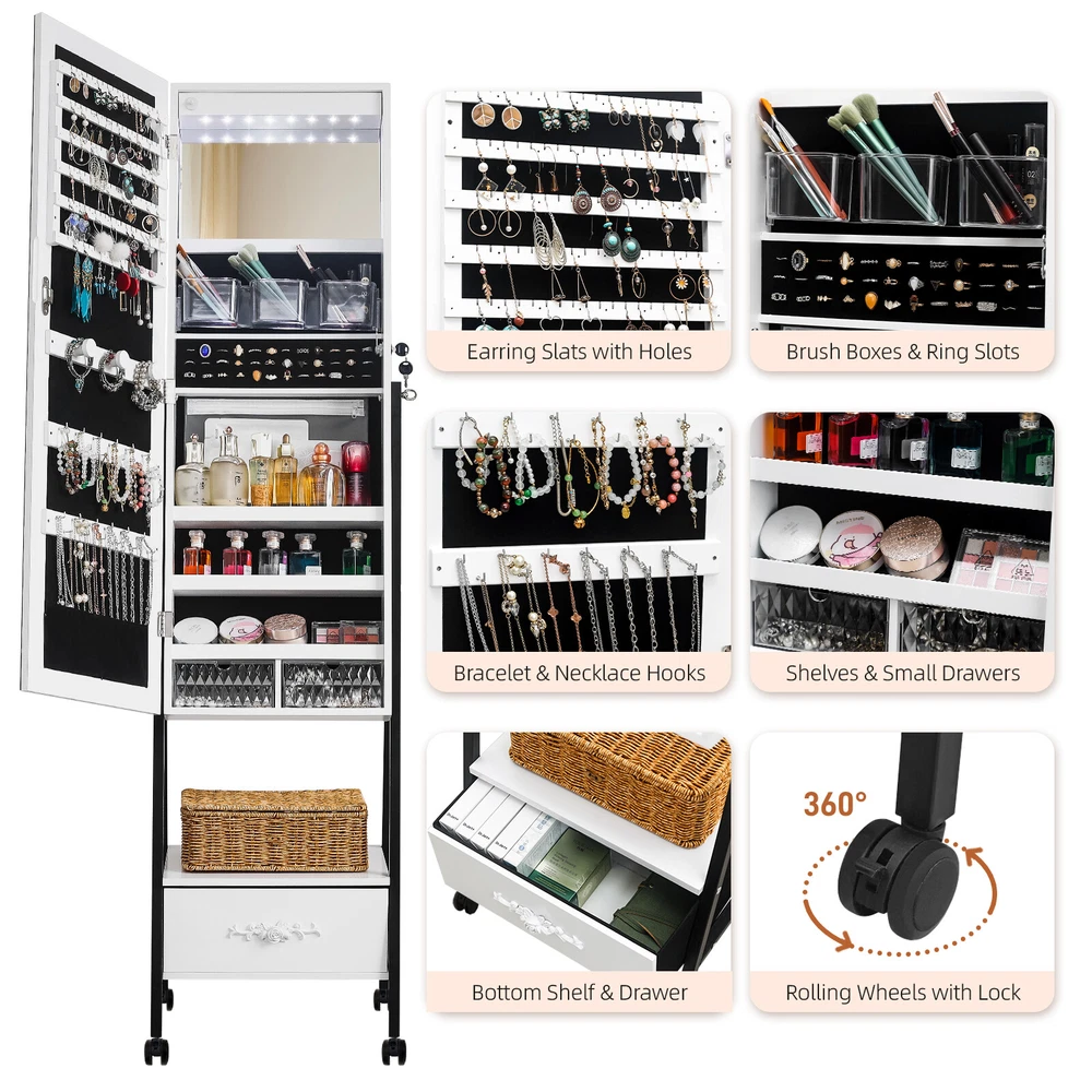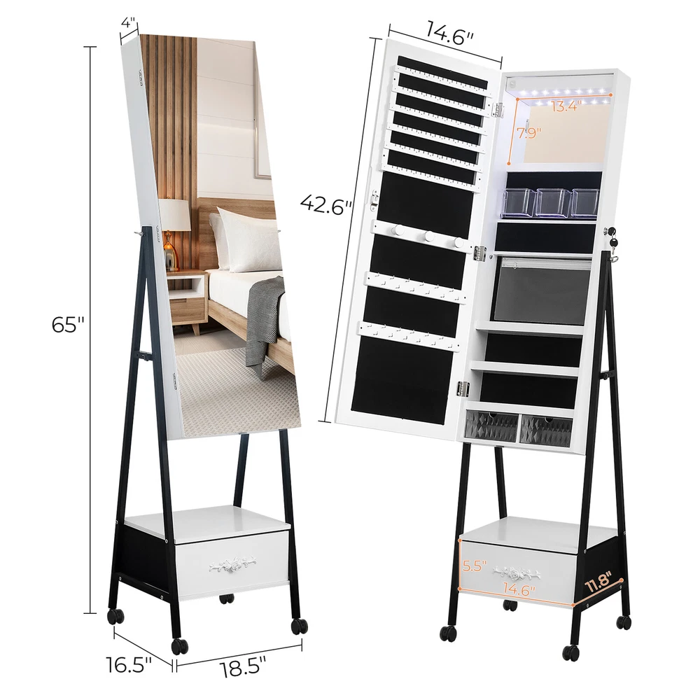 Introductions: 1. Excellent quality for durable:This jewelry mirror cabinet adopts high-density MDF and high-level painting technology on the surface, which makes the whole product look beautiful and generous. What's more, it also has the functions of moisture-proof, corrosion-resistant and wear-resistant, which can't be compared with other low-end jewelry cabinets 2. The interior adopts white light beads, making every woman a delicate girl. 3. There are 108 circular grooves on the right side of the cabinet (18 in each row, totaling 6). Add 36 circular grooves on the right side of the cabinet, 12 in each row, totaling 3, as well as one endoscope, three acrylic storage boxes, three shelves, and two acrylic drawers. We have designed 3 earring racks, 2 rows of necklace hooks, 1 PP storage bag, and an exquisite external drawer to help you store various items 4. This large total mirror (14.57 inches wide x 42.52inches high) is enough to let you see at a glance whether your focusing is complete. In addition, the configuration of locks and keys makes your jewelry cabinet better protected. If it is placed at a certain height, it can ensure that children cannot touch it and improve safety Features: 1. White light beads 2. Full-length mirror 3. Floor design 4. Convenient and practical Specifications: 1. Frame Material: MDF 2. Mirror Material: Glass 3. Color: White Black 4. Overall Dimensions: (18.5 x16.53 x 64.96)" / (47 x42x 165)cm (L x W x H) Package Includes: 1 x Jewelry Cabinet 1 x Instructions 1 x Pack of Accessories 2 x Key Note: 1.When receiving the goods, please confirm the product according to the listing of instructions. Once you find Less pieces, please provide relevant pictures to contact us. We will deal it in the time. 2.Please install goods with the instruction manual. 3.It is recommended that the installation should not be too tight to adjust easily. After the structure is installed, firm the interface for more stability.