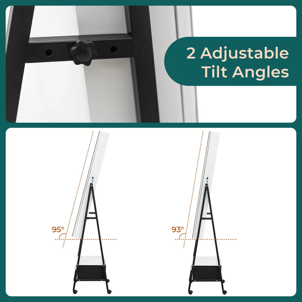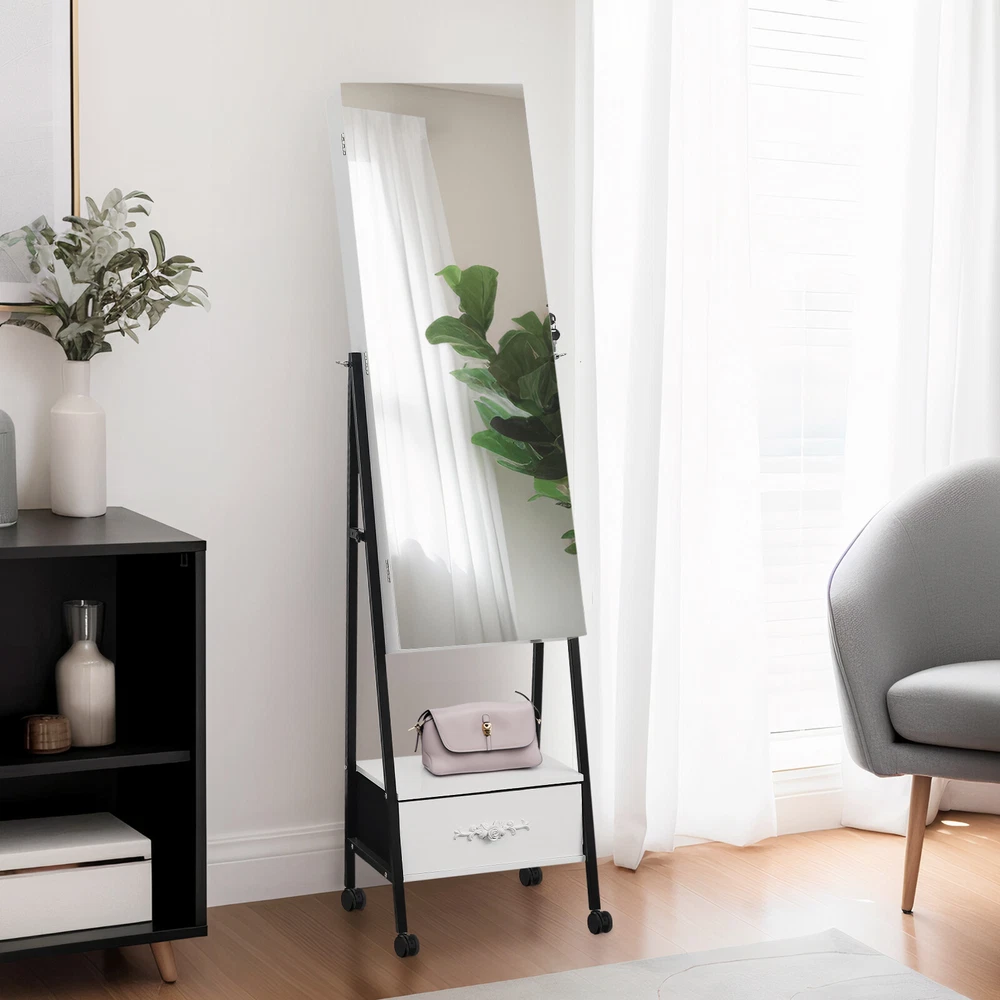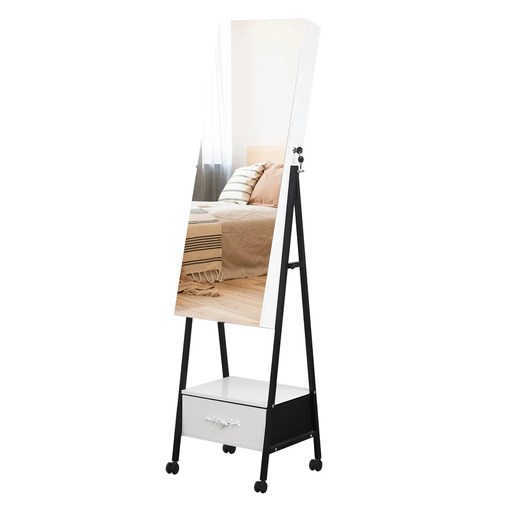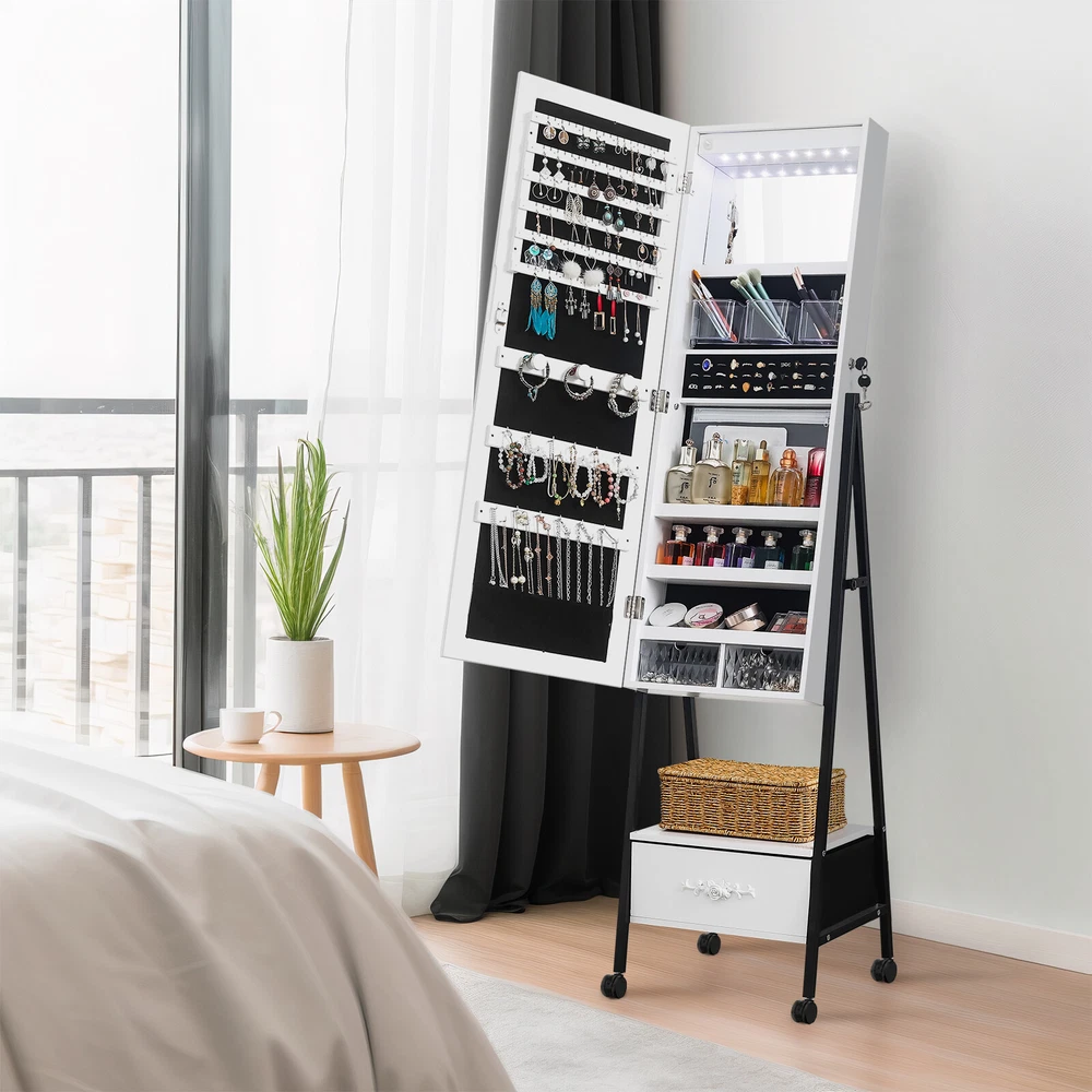 Introductions: 1. Excellent quality for durable:This jewelry mirror cabinet adopts high-density MDF and high-level painting technology on the surface, which makes the whole product look beautiful and generous. What's more, it also has the functions of moisture-proof, corrosion-resistant and wear-resistant, which can't be compared with other low-end jewelry cabinets 2. The interior adopts white light beads, making every woman a delicate girl. 3. There are 108 circular grooves on the right side of the cabinet (18 in each row, totaling 6). Add 36 circular grooves on the right side of the cabinet, 12 in each row, totaling 3, as well as one endoscope, three acrylic storage boxes, three shelves, and two acrylic drawers. We have designed 3 earring racks, 2 rows of necklace hooks, 1 PP storage bag, and an exquisite external drawer to help you store various items 4. This large total mirror (14.57 inches wide x 42.52inches high) is enough to let you see at a glance whether your focusing is complete. In addition, the configuration of locks and keys makes your jewelry cabinet better protected. If it is placed at a certain height, it can ensure that children cannot touch it and improve safety Features: 1. White light beads 2. Full-length mirror 3. Floor design 4. Convenient and practical Specifications: 1. Frame Material: MDF 2. Mirror Material: Glass 3. Color: White Black 4. Overall Dimensions: (18.5 x16.53 x 64.96)" / (47 x42x 165)cm (L x W x H) Package Includes: 1 x Jewelry Cabinet 1 x Instructions 1 x Pack of Accessories 2 x Key Note: 1.When receiving the goods, please confirm the product according to the listing of instructions. Once you find Less pieces, please provide relevant pictures to contact us. We will deal it in the time. 2.Please install goods with the instruction manual. 3.It is recommended that the installation should not be too tight to adjust easily. After the structure is installed, firm the interface for more stability.