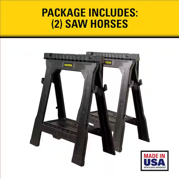 Stanley 31 in Folding Sawhorse (2 Pack) Portable Sturdy Saw Horse Tray Stand Set The Stanley Portable Folding Sawhorse secures your sawing surface. These sawhorses are collapsible for easy transporting and storage. When used as a pair, this lightweight and sturdy sawhorse twin pack can hold 1,000 lbs. 31 in. H for comfortable working Multi-purpose side hangers for storage of accessories Strong tray connection helps prevent sawhorse from collapsing under heavy load 2 built-in v-grooves help hold materials in place for cutting Ruler with rubber points for load stability 1,000 lbs. weight capacity per pair 2 saw horses