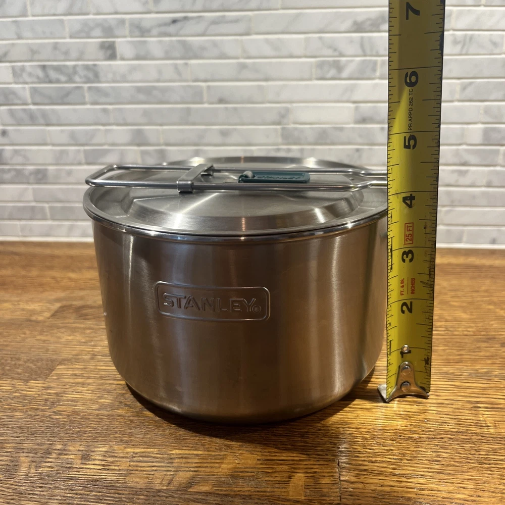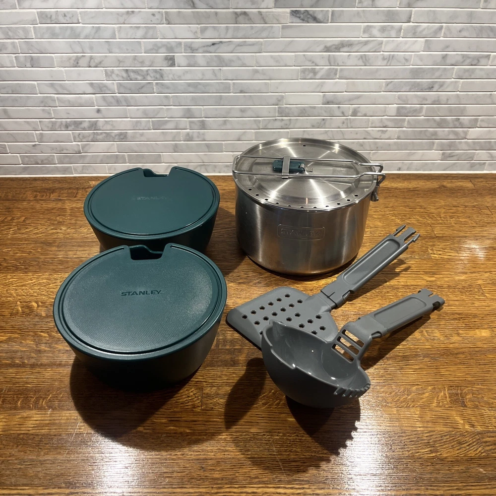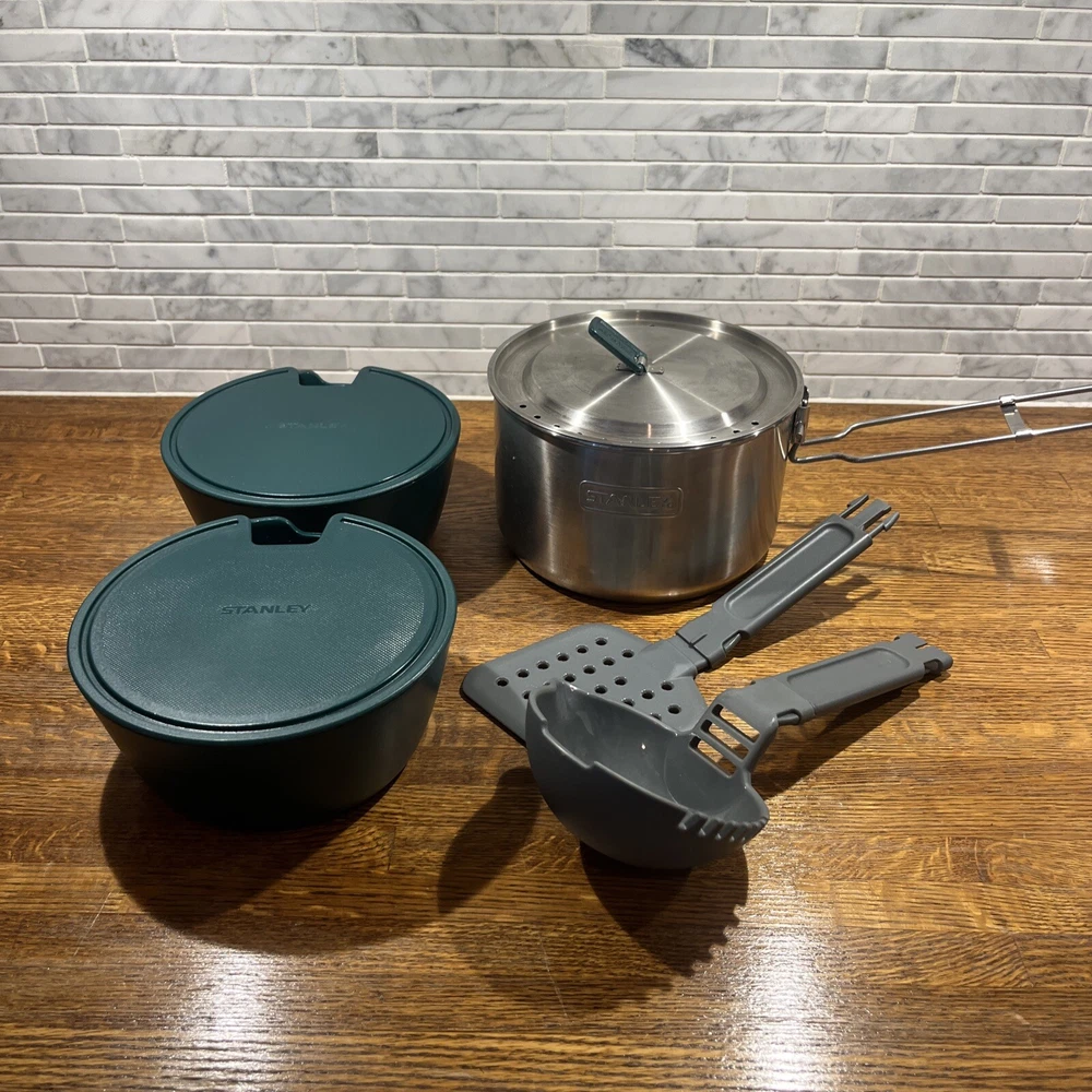 Enjoy your outdoor adventures with the Stanley Camping Cook Set Mess Kit. This 8-piece set includes a 1.6qt/1.5L stainless steel pot pan with bowls and lids, ladle and spatula. perfect for cooking up delicious meals while camping or tailgating. The set features BPA-free materials and is dishwasher safe for easy cleaning. The Stanley Camping Cook Set Mess Kit is designed with durable stainless steel and is perfect for any outdoor activity. With a 4" item height, this cook set is easy to carry and includes all the necessary items for cooking. Get ready for your next camping trip or tailgate party with this amazing cook set.