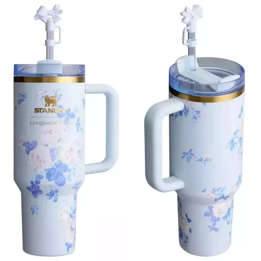 This cups come with straws and butterfly straw stoppers. Stanley x LoveShackFancy Floral Tumbler Collection – Limited Edition! Add a touch of elegance and whimsy to your drinkware collection with these limited-edition Stanley tumblers, designed in collaboration with LoveShackFancy. Featuring romantic floral patterns in soft pastels and topped with a unique bow-topped straw lid, these insulated tumblers are perfect for keeping your drinks hot or cold in style. Ideal for gifting or brightening up your daily hydration routine, these tumblers combine Stanley’s legendary quality with LoveShackFancy’s signature floral aesthetic. Specification Category: Drinkware Brand: Stanley x LoveShackFancy Color Options: Blue, Pink, Purple, white (all with floral patterns) Capacity: 40 oz Material: Stainless steel with insulated double-wall technology (Food-grade, BPA-free) Design Details: Floral patterns, bow-topped straw, translucent lid Features: Keeps drinks hot or cold for hours, easy-to-hold handle ✔ 【Premium Materials】 Crafted from high-quality 304 stainless steel, this tumbler is durable, eco-friendly, and reusable, offering a safe alternative to plastic. Each sip is pure and reassuring, making it suitable even for children. ✔ 【Elegant Straw and Lid Design】 With a thoughtfully designed straw and ergonomic handle, this tumbler fits securely in most car cup holders while keeping your hands dry and comfortable. Whether at home, camping, or on the go, it’s the ideal companion for savoring life’s moments. ✔ 【Versatile for All Occasions】 From lively parties to serene beach days, the office to home, this tumbler accompanies you anywhere. It also makes a thoughtful gift for family and loved ones on Valentine’s Day, Halloween, Thanksgiving, or Christmas. Beyond a tumbler, it’s a gesture of warmth and care. ✔ 【Double-Wall Insulation for All-Day Hydration】 With a 40oz capacity and dimensions of 27 x 10 x 7.5 cm, this tumbler features a tapered base that fits larger cup holders (7.5 cm+). Keep hydrated all day and enjoy your drink at just the right temperature. ✔ 【Long-Lasting Temperature Retention】 Your perfect travel companion, keeping drinks warm for up to 5 hours and cold for up to 8 hours, allowing you to enjoy favorite beverages at leisure. The vacuum insulation ensures the double-walled design remains cool to the touch, letting you drink comfortably without any worry.