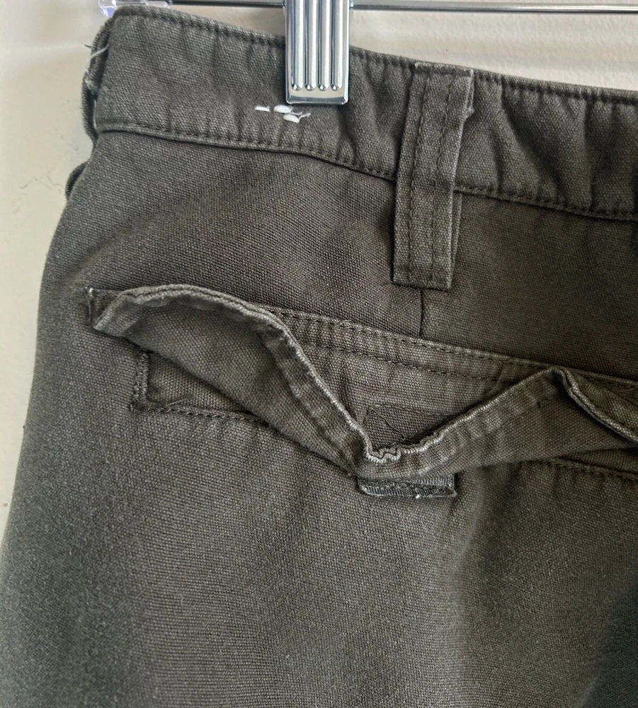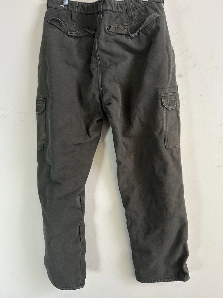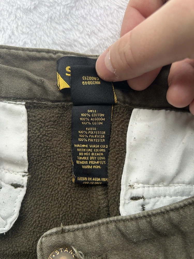 Upgrade your workwear with these Stanley pants gray(greenish) color and carpenter style. Made of a cozy blend of polyester and cotton, these pants have a flat front and straight leg style, with a mid-rise waist of 36 inches. They feature a zip and button closure, and are lined with fleece for added warmth, making them perfect for fall, winter, and spring seasons. These pants have pockets for practicality, and are machine washable for easy care. The size type is regular, with a fit that's just right for everyday wear. Get these solid-colored pants for your next work project, without worrying about their condition. Tag says 36/34 but measures 34/30
