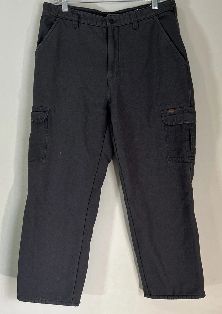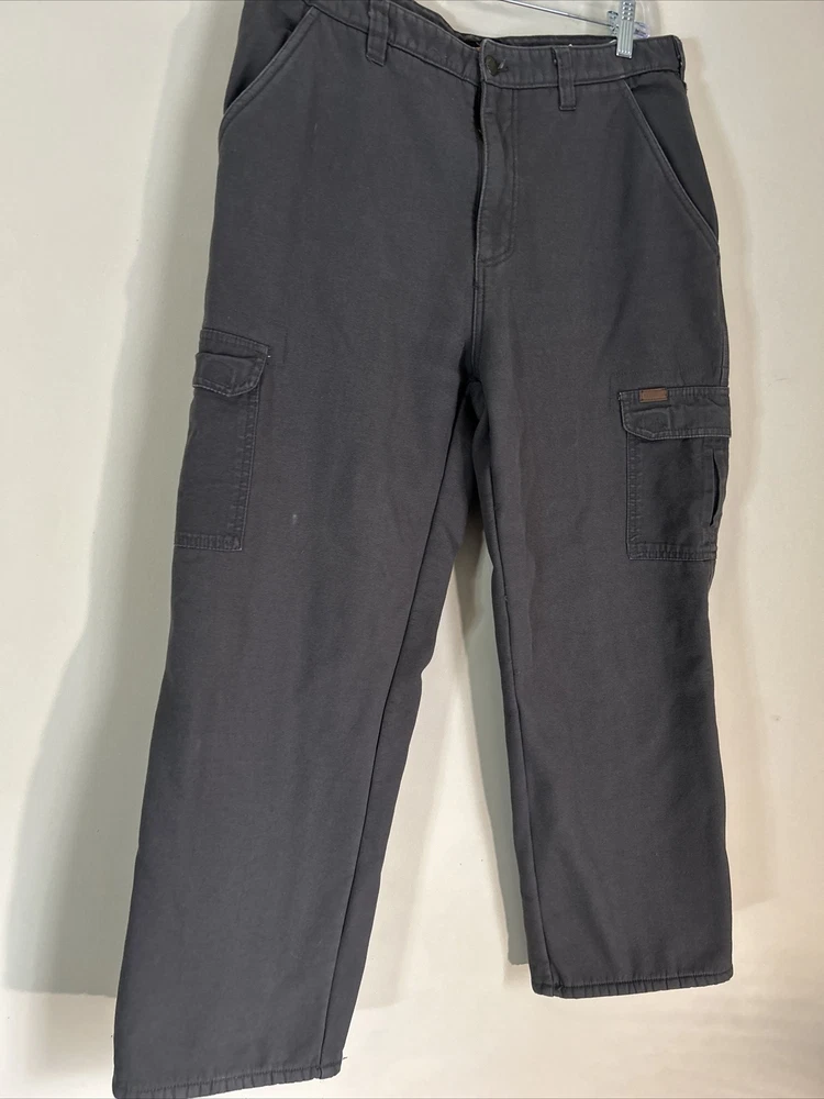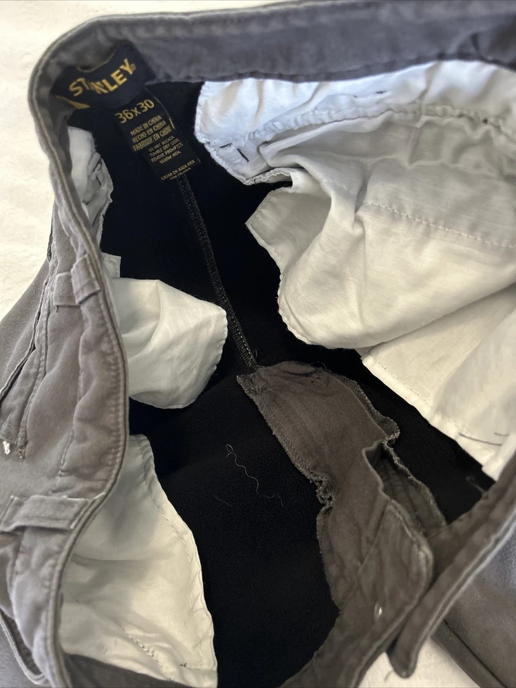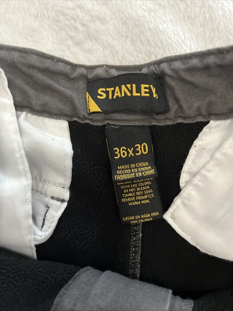Closure: Button, Zip Leg Style: Straight Season: Fall, Spring, Winter Personalize: No Features: Lined, Pockets Size Type: Regular Front Type: Flat Front Fabric Type: Fleece Vintage: No Fit: Regular Pattern: Solid Waist Size: 36 in Color: Gray Material: Cotton, Polyester Type: Pants Brand: Stanley Occasion: Workwear Style: Carpenter Country/Region of Manufacture: China Department: Men Garment Care: Machine Washable Handmade: No Inseam: 30 in Rise: Mid (10-12 in) Size: 36