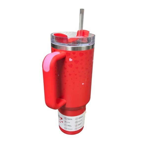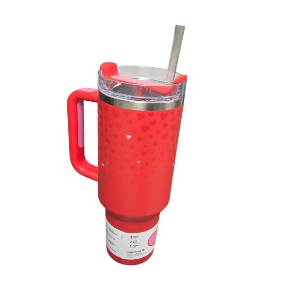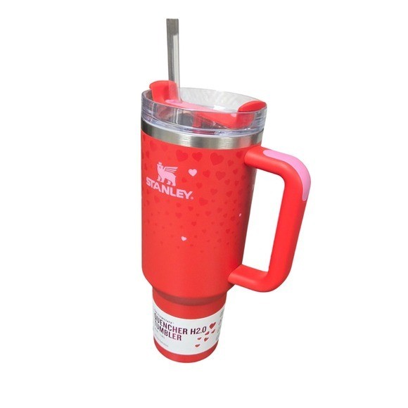 Embrace all-day hydration with this vibrant Stanley Quencher H2O Tumbler. Its cheerful red exterior adorned with a playful heart pattern makes staying refreshed a joy. The generous 40oz capacity ensures you have plenty of your favorite beverage on hand, while the included stainless steel straw offers a convenient and stylish way to sip. The durable stainless steel construction keeps drinks cold for hours, perfect for busy days at the office, outdoor adventures, or simply lounging at home. Keywords: Stanley tumbler, 40 oz, red, hearts, straw, insulated, travel mug, Valentine's Day, gift idea, hydration, reusable, stainless steel