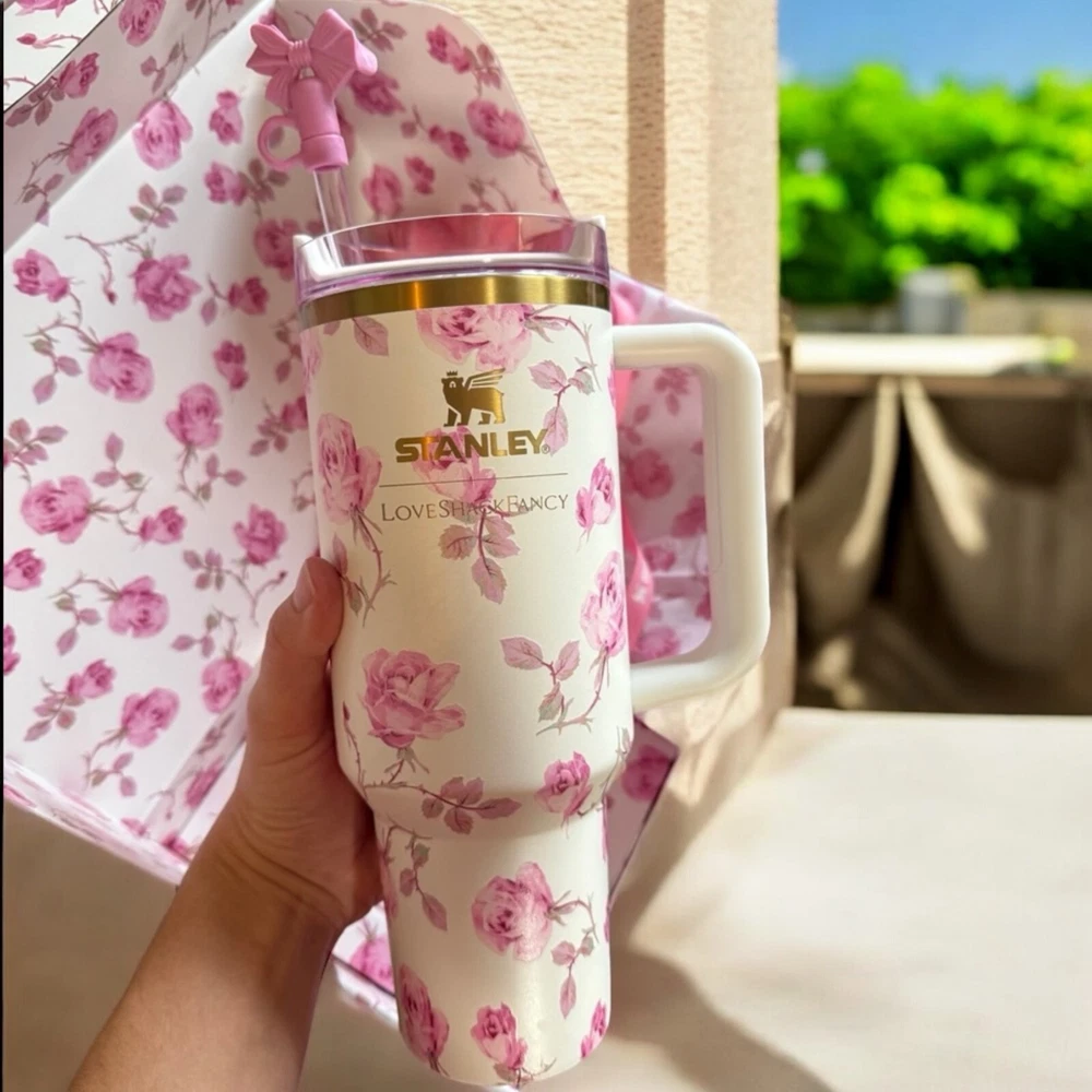 No dustbag Introducing the Stanley X Love Shack Fancy Quencher Tumbler in the color Ribbon Rosa. This tumbler is perfect for those who love to enjoy their favorite beverages in style. Made by the renowned brand Stanley, this tumbler is designed to keep your drinks hot or cold for hours. With a 40 oz capacity, this tumbler is perfect for your daily commute or outdoor adventures. The tumbler features a unique design with ribbon rosa color and comes with a clear lid to prevent spills. Whether you're a coffee or tea lover, this tumbler is a must-have addition to your collection.