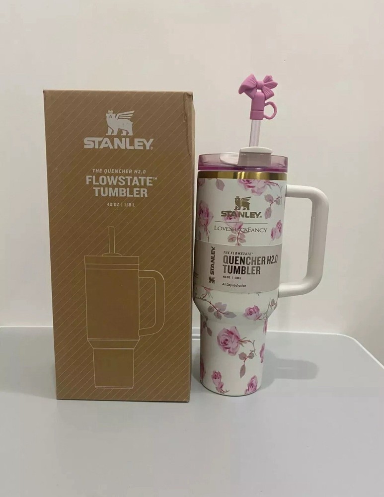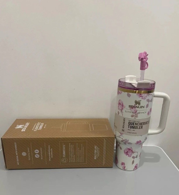 The Stanley x Love Shack Fancy 40oz Quencher Stainless Steel Tumbler is a novelty mug designed for all occasions. It comes in a Gift Box Orchid Color and is made of stainless steel. Not associated with any name brands