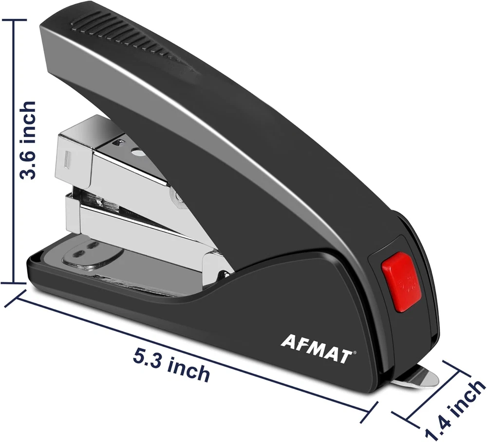 Store New Arrivals Add to Favorite View Feedback Contact Stapler for Desk, 50 Sheet Effortless Desktop Stapler Staple with One Finger, Portable Ergonomic Handheld Staplers Heavy Duty, Built-In Remover, Space save Size, Good for Home & Office ES10 Description Number of Fasteners 50 Color Black Material Sturdy Plastic,Metal Product Dimensions 5.3"L x 1.4"W 50-SHEET Stapling Capacity: Want efficiency in a busy office? Go get one with a larger capacity. AFMAT office stapler for desk can staple up to 50 sheets at a time without any struggle(If use 70 gsm paper and staple with 5/16" long leg: #23/8 ) and no longer have to re-do a stapling, which is well intended for heavy use in office, home, school or other. (Tips: While stapling, please be sure to press it down way deep enough before releasing) 50% EFFORT REDUCED Office Stapler: If hand comfort is your priority, this desktop stapler will do the trick. This desk stapler is ergonomically designed: Fits comfortably in one hand(doubles as a handheld stapler) and staples papers swiftly with 50% effort reduced(support one finger operation), which is ideal for frequent users and hand arthritis suffers without breaking a sweat, especially when stapling thru a thicker bundle of paper. Easy to Use & Quick Reloading: Easy to use as a one finger touch stapling stapler on the desktop or a handheld stapler on the go! The release button makes refilling a breeze: Push the button and the magazine will pop out for fast reloading, which saves efforts and boosts efficiency in a fast-paced office. Suitable staple types: staples with 1/4" long leg for 20-25 sheets: #23/6, #24/6, #26/6(standard staples) and staples with 5/16" long leg for 40-50 sheets: #23/8 (Staples not included) JAM-FREE Stapler for Desk: This stapler with a built-in staple remover for stapling and unstapling almost everything. The JAM-FREE tech is for stapling a thicker document without jams or halfway staples. The whole stapling process is smooth, lightning fast and relatively quiet, and the staple leg after stapling is well bent and clean looking. The built-in staple remover at the back is easily accessible and always there ready for use. Space Save & Last for Years: This stapler, constructed with a combination of super durable plastic(housing) and solid metal(mechanical system), is built to last from year to year. Being heavy duty for heavy use, but never being clunky, this stapler has both a small footprint on your desk and great portability for travelling. Use it anywhere and anytime with minimal finger force only, instead of batteries, electricity or power consumption. Item dimensions: 5.3(L)*1.4(W)*3.6(H) inches Product description AFMAT Ergonomic Stapler for Desk, Low Force, 50 Sheets Capacity, One Finger Touch Stapling, Reduced 50% Effort Want a useful stapler for busy paperwork? Come try this one! AFMAT office stapler for desk can staple up to 50 sheets at a time without any struggle. It is ergonomically designed: Fits comfortably in one hand (doubles as a handheld stapler) and staples papers swiftly with 50% effort reduced(support one finger operation), which is ideal for frequent users and hand arthritis suffers. Just push the release button and the magazine will pop out for fast reloading. Suitable staple types: staples with 1/4" long leg for 20-25 sheets: #23/6, #24/6, #26/6(standard staples) and staples with 5/16" long leg for 40-50 sheets: #23/8. The built-in staple remover at the back is easily accessible and always there ready for use. Made of super durable plastic and solid metal, it is built to last from year to year! Compact, lightweight and space saving, easy to use as a one finger touch stapling desk stapler or a handheld stapler. This is a cool black stapler for the classroom, office and home! 50 Sheets Effortless Stapler for Desk AFMAT stapler features an ergonomic designed body which staples up to 50 sheets (70 gsm paper) swiftly with 50% effort reduced. It is great for frequent users and hand arthritis suffers. This ergonomic stapler fits comfortably in one hand and can be used as a one finger touch stapling stapler on the desktop or a handheld stapler on the go! Works with a variety of staples Just push the release button and the magazine will pop out for fast reloading. Suitable staple types: Staples with 1/4" long leg for 20-25 sheets: #23/6, #24/6, #26/6(standard staples) Staples with 5/16" long leg for 40-50 sheets: #23/8 NOTE: Staples not included. Tips: 1. While stapling, please be sure to press it down way deep enough before releasing, otherwise the staple may get stuck halfway thru stapling. 2. Please note that this stapler cannot be opened for tacking onto bulletin boards. FEATURES: 50 Sheets Capacity Reduced 50% Effort Easy to Use & Load Quiet Stapling One Finger Touch Stapling Built-in Staple Remover Ergonomic Design Portable & Space Saving AFMAT Ergonomic Stapler, Low Force, 50 Sheets Capacity, with Reload Button & Built-in Staple Remover, Great for Office, School, Classroom, Home Reduced 50% Effort If hand comfort is your priority, this desktop stapler will do the trick. This desktop stapler is ergonomically designed: Fits comfortably in one hand(doubles as a handheld stapler) and staples papers swiftly with 50% effort reduced(support one finger operation), which is ideal for frequent users and hand arthritis suffers without breaking a sweat, especially when stapling thru a thicker bundle of paper. 50 Sheets Capacity Want efficiency in a busy office? Go get one with a larger capacity. AFMAT office stapler for desk can staple up to 50 sheets at a time without any struggle(If use 70 gsm paper and staple with 5/16" long leg: #23/8 ) and no longer have to re-do a stapling, which is well intended for heavy use in office, home, school or other. Quick Load Button The release button makes refilling a breeze: Push the button and the magazine will pop out for fast reloading, which saves efforts and boosts efficiency in a fast-paced office. Suitable staple types: S