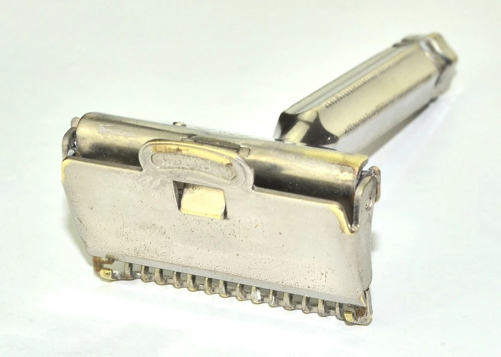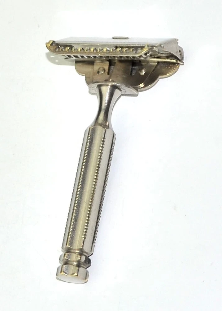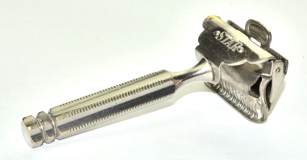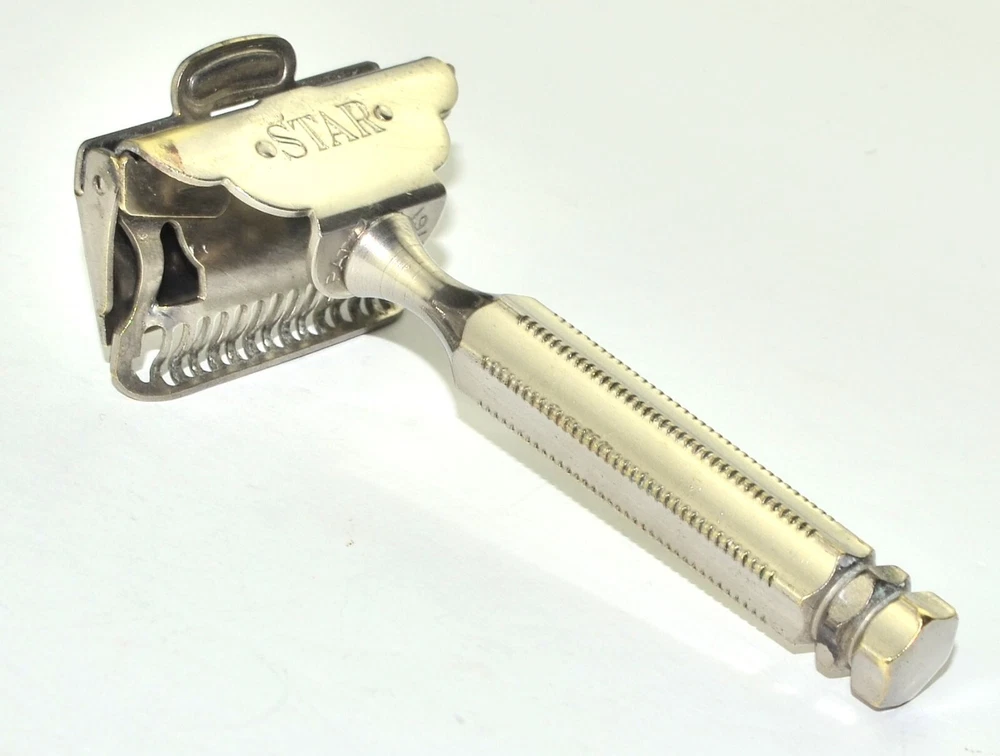 Offered is a sturdy, brass nickel plated Star brand 1912 Head single edge razor. This is probably the most popular head design of all the early single edge razors. It's been thoroughly cleaned and polished, plus sanitized, and is ready for use. It's in great mechanical condition. The cosmetic condition is fair with a moderate amount of plate wear/brassing around the head. Naturally this doesn't effect the shaving experience. Single edge blades for this razor are easily found online, or in the shaving sections of many local drug stores. All photos and listing text is copyrighted and not for public use. Prices are competitive but firm. E1