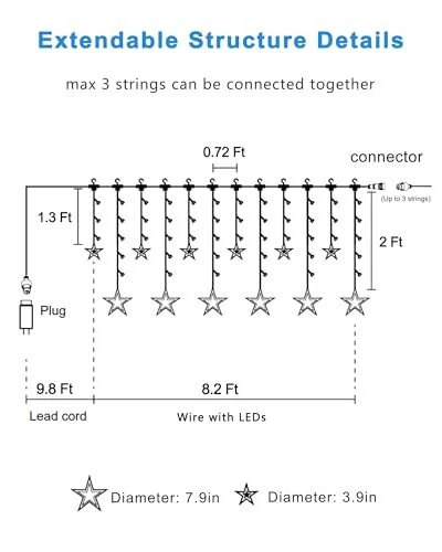 Return Policy Fast Delivery Trusted seller Star Curtain Lights 138 LED 12 Star Multicolor Christmas Lights 8.2 Ft Connectable Window Lights with Remote Plug in Curtain String Lights for Christmas Ramadan Bedroom Indoor Outdoor Decor Product Description 8 Modes & Remote Control: Press the button on the plug or the remote control to set the Christmas lights between 8 modes. The remote control can also adjust brightness and set timer, which makes the twinkle lights be 6-hour on and 18-hour off Extendable Length: Our star curtain lights is 18 Ft in total, wire with LEDs: 8.2 Ft, the lead cord: 9.8 Ft, spacing between neighbouring strands: 0.72 Ft. Max 3 sets string lights can be connected together to cover a larger area Safe to Power: Approved by authoritative UL Certification, this window lights is applicable to US standard outlet. 30V low voltage, the LED Christmas lights will keep at low temperature after long time using, safe for using Unique Structure: The LED Qty of the star string lights is 138, including 12 stars( 6 big+ 6 small). The diameter of the big star is 7.9 inch, which each string droops 2 Ft. The diameter of the small star is 3.9 inch, which each string droops 1.3 Ft Adding Ambience: Per set multicolor christmas lights has 12 hooks at the top that it's easy to hang on the curtain. The hanging lights will bring more joy for indoor outdoor Ramadan, Christmas, wedding, birthday, party, bedroom, backdrop decoration Shipping Returns Payment Shipping Shipping is FREE to all addresses other than APO/PO boxes in the lower 48 states. All our stock ships from US-based warehouses. Shipped via USPS or UPS (depending on location and package weight) Unless stated otherwise, all orders will ship within 24-72 hours of your payment being processed. Check our feedback to see the great reviews of FAST shipping we offer. Returns Seller does not accept returns Payment We currently accept payment via eBay managed payments only. Once payment is cleared, we will dispatch your shipment within 1-3 business days. Please refer to the "Shipping" tab for more information regarding shipping speed to your destination.