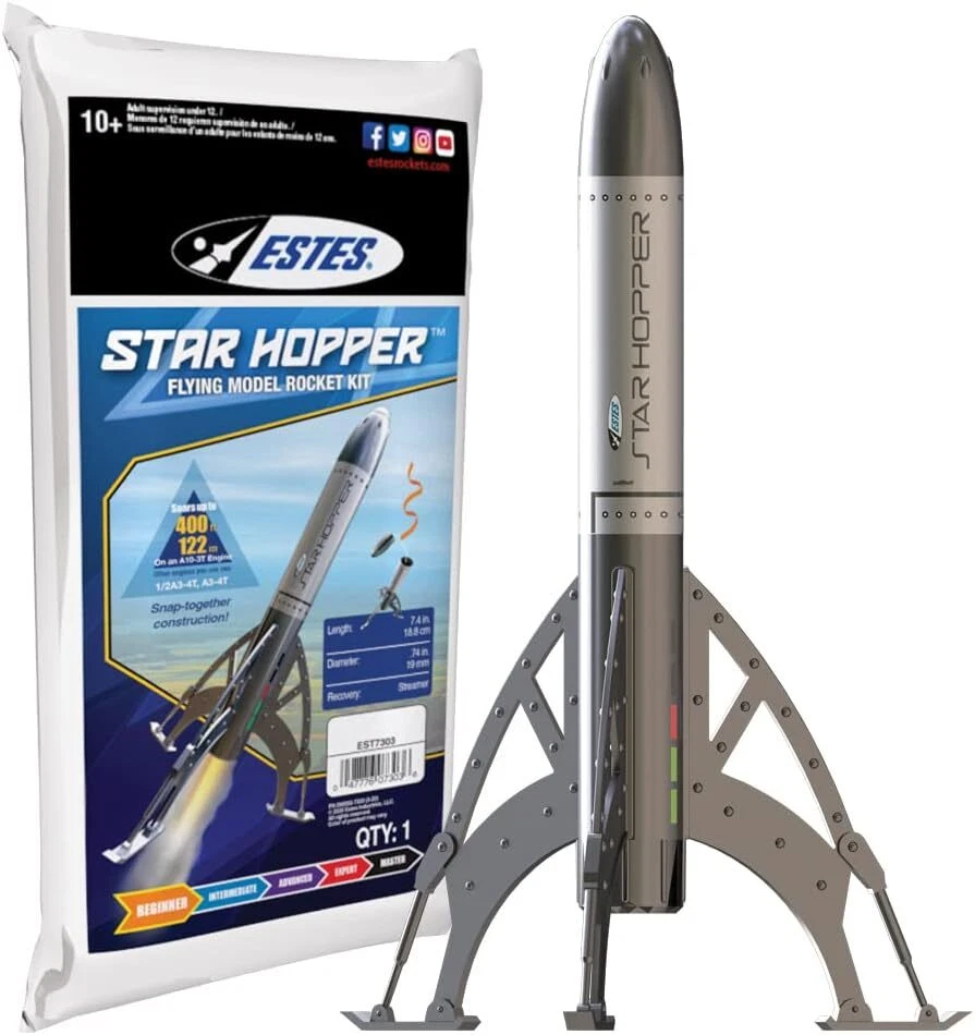 Further Details Title: Star Hopper Condition: New Description: Based on rumored 1950s secret project to counter the “flying saucer threat.” The Estes Star Hopper is a no-glue, no-paint Beginner-Level kit that you can build and launch up to 400 feet all in the same day. Features detail-molded plastic parts, atomic-age styling, and a 18-inch streamer for recovery. Type: Pogo Sticks & Space Hoppers Brand: Estes Item Weight: 45g Release Date: 10/01/2021 Age Level: ‎10 years and up Dimensions: ‎18.8 x 1.88 x 18.8 cm; 45.36 Grams Item Length: 188mm Item Width: 18mm Item Height: 188mm Color: ‎Multicolor Material: ‎Plastic Batteries: ‎No Prep the Estes Star Hopper with a recommend Estes engine (not included) and get ready for fantastic flights up to 400 feet – great for demonstrations and small field flights. Watch at apogee as the rocket ejects a 18-inch streamer to slow its fall and help you track it to the ground. With the twist-on engine retainer for fast engine loading, and a relatively wide body tube for easy ejection wadding and streamer packing, you’ll have your rocket ready to launch in no time! While the real Star Hopper may only be a myth, the Estes Star Hopper is real and ready to fly today! Missing Information? Please contact us if any details are missing and where possible we will add the information to our listing.