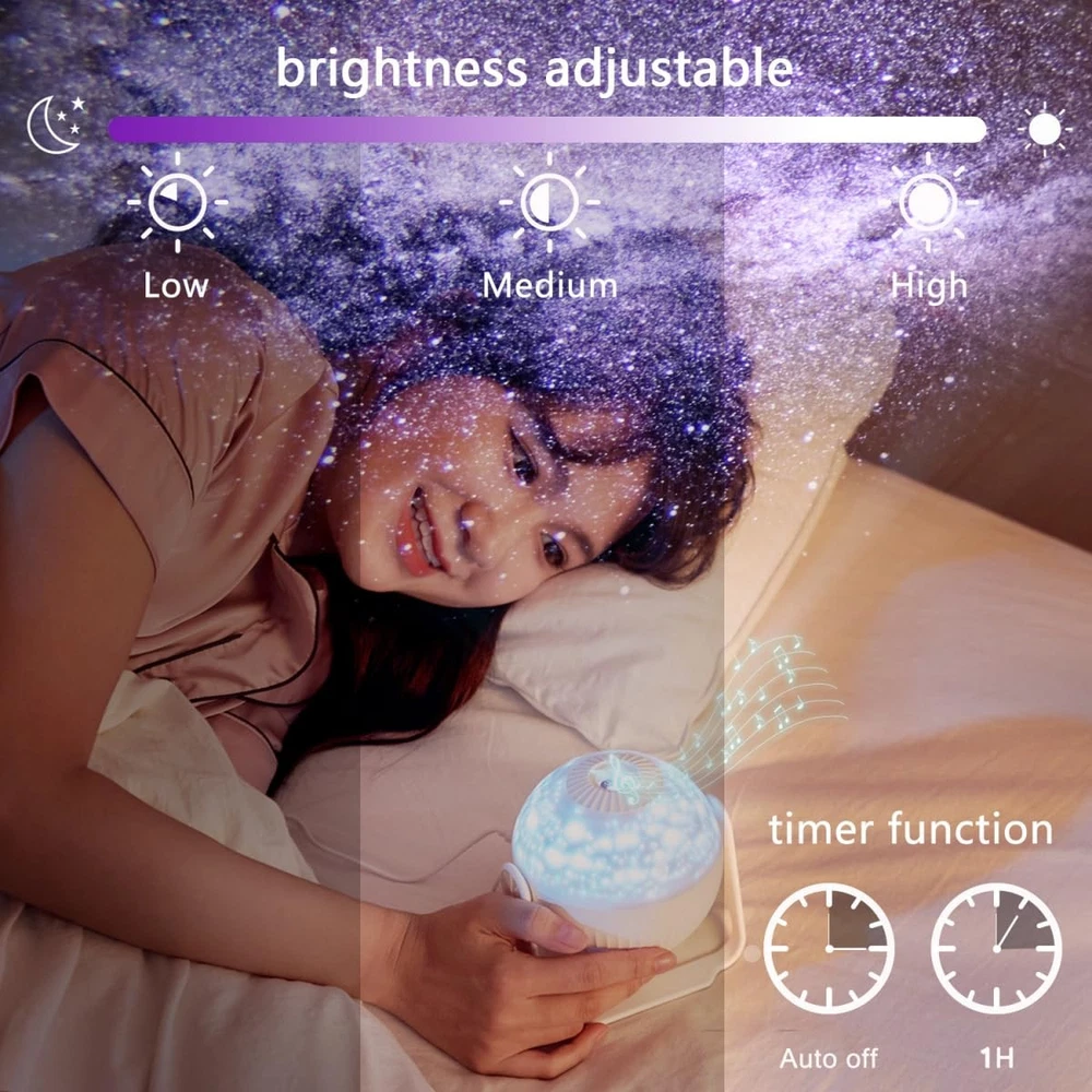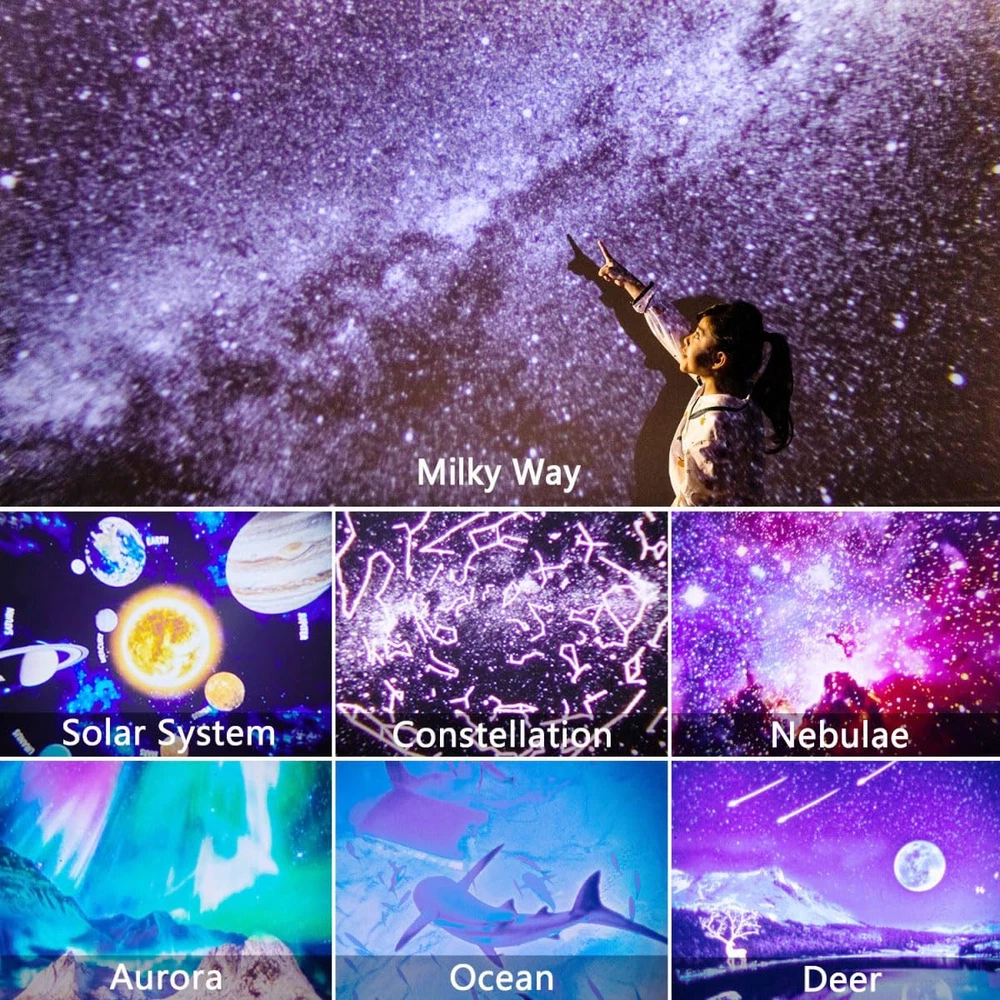 【HD Zoom Projection Light 】The HD star projector adopts a classic appearance, loved by both adults and children. With its delicate design and high-quality materials, it guarantees excellent quality. The high-definition lens provides clear projection effects. As a planetarium, when the cover is removed, it projects beautiful patterns on the ceiling and walls. The mesmerizing starry sky view gives a feeling of being in a real planetarium! 【7 Types of Film】Galaxy projector includes 7 types of film: Milky Way, Nebula, Aurora, Solar System, Constellations, Sea, and Deer. It projects a dreamy galaxy and impressive nebula, recreating a stunning galactic night sky indoors. You can enjoy a quiet galaxy in your bedroom. The movie scenes are all combined with starry skies or the sea, helping to develop children's imagination and creativity. Bring the starry sky inside and comfortably explore the cosmos from home. 【Bluetooth Speaker & Remote Control】The galaxy projector with a remote control features a built-in Bluetooth speaker that provides excellent sound quality. You can connect it to your mobile phone via Bluetooth and enjoy your favorite music. With the remote control, you can easily change the color of the lights, adjust the brightness/volume, switch songs, change the lighting mode, set a timer, and turn the lights on/off. The lighting can be easily controlled with the remote control. 【Timer Function & Light Color Changing】Projector with timer setting, color changing, 360-degree rotation design, USB connection, and adjustable brightness, it becomes even more entertaining. It can be set to stationary or rotating mode based on your preference. With the timer setting function, it automatically turns off the power. You can rest assured even if you fall asleep. the light colors can also be adjusted. The LED light offers yellow, white, blue, and mixed lighting modes. 【Guarantee and after-sales service】We value our customers and strive to provide them with a wonderful experience. Through strict quality inspection and certification, the product is carefully packaged before shipment. If there is any malfunction, our store offers an unconditional return or exchange guarantee. If you have any concerns or questions during use, please feel free to contact us, and we will be happy to assist you in a courteous manner.