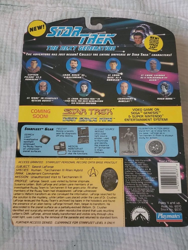 This Star Trek: The Next Generation action figure is a must-have for any fan of the beloved TV show. Featuring Lt. Comm. Laforge Tarchannen III, this 5in. figure is in its original packaging and has never been opened. The figure is part of the Star Trek Next Generation 7th Season collection and is perfect for boys and girls alike. Made by Playmates Toys in 1994, this figure is a great addition to any toy collection. The character is from the popular Aliens movie and is sure to impress any Star Trek fan. Don't miss your chance to own this rare and highly sought-after action figure.