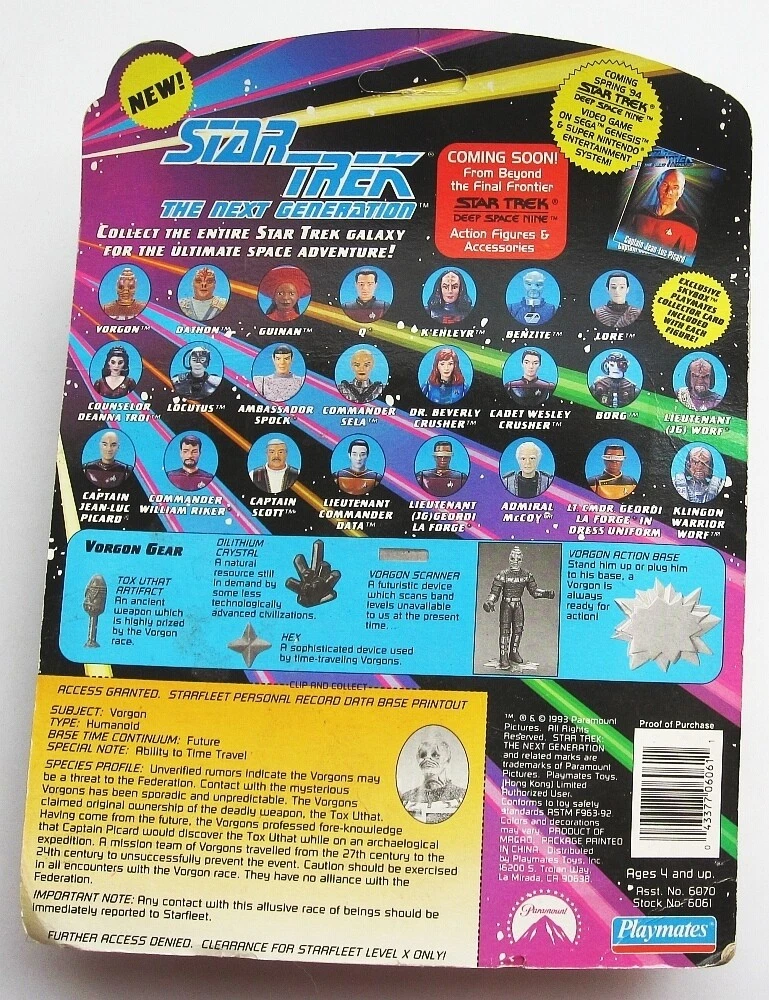 1993 Star Trek The Vorgon 4.5" action figure from Playmates, mint in NEVER-OPENED, factory-sealed package, as shown in pic. Package is very good, a little spot of veining, slightly soft corner. Minor edgewear, may have other minor defects. Figure is undamaged, has never been opened. Ships FAST in a sturdy unmarked cardboard box -- no worries! RETURNS: Accepted if item is still in its original packaging. We do not accept items that have been opened and used or examined by the buyer. Feel free to ask questions if you have them - we offer discounts on multiple purchases! Click here to visit our eBay Store and save on shipping with ONE INTERNET STOP! With over 1500 different items to choose from, we have something for every kid on your list (even the big ones)! Buy with confidence from us -- we have over 25 years experience selling on eBay and other venues! You may save on shipping by purchasing multiple items.