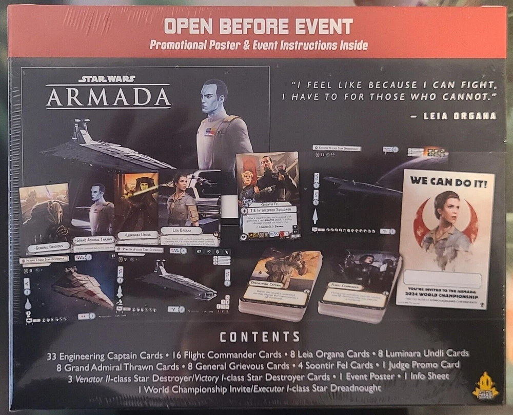 This is a sealed Star Wars: Armada Store Championship 2023 Tournament Kit. Contents: 33 Engineering Captain Cards 16 Flight Commander Cards 8 Leia Organa Cards 8 Luminara Undli Cards 8 Grand Admiral Thrawn Cards 8 General Grievous Cards 4 Soontir Fel Cards 1 Judge Promo Card 3 Venator II-class Star Destroyer/Victory I-class Star Destroyer Cards 1 Event Poster 1 Info Sheet 1 World Championship Invite/Executor I-Class Star Dreadnought. (World Championship Invite no longer valid)
