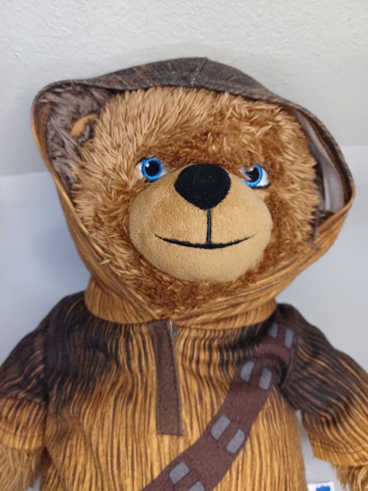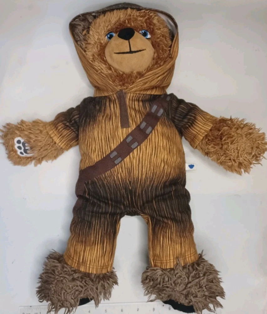 Star Wars fans can add a unique piece to their collection with this 17-inch used loose item with wear as shown, Chewbacca plush toy from Build-A-Bear Workshop. The brown bear is made of high-quality plush material and comes with clothing items to dress it up. This rare and retired collectible is perfect for display or play, and is sure to be a hit with any Star Wars enthusiast. The bear is part of the Star Wars collection and features intricate details such as the iconic Star Wars logo on its paw. It is a one-of-a-kind item that is sure to be a conversation starter. Add this Chewy Chewbacca plush toy to your collection today!