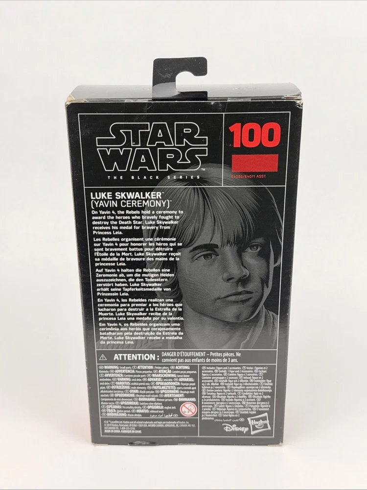 This is a Star Wars The Black Series Luke Skywalker (Yavin Ceremony) action figure from Hasbro. It includes a gun accessory and is made of plastic in a 1:12 scale. The figure is a custom design and is part of the Star Wars franchise. It was manufactured in 2020 and is suitable for ages 4 and up. The figure features Luke Skywalker in his Yavin Ceremony attire from the Star Wars series.