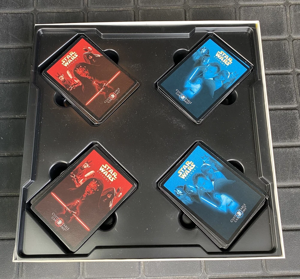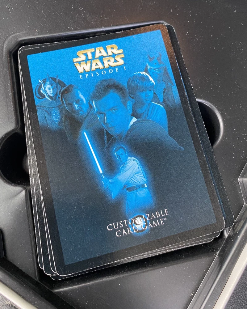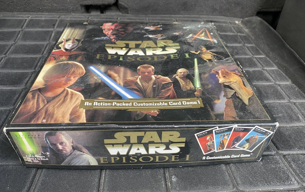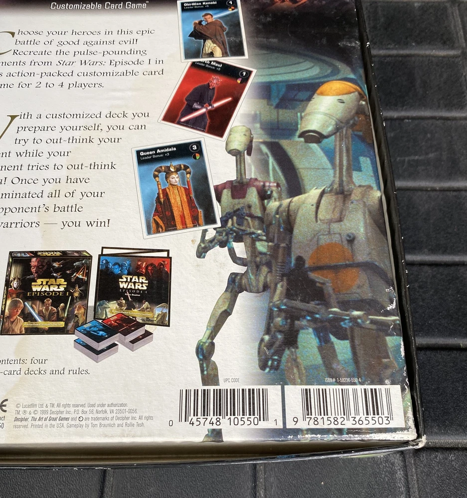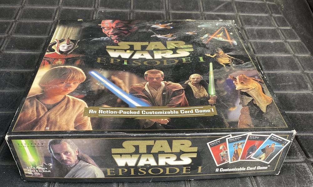 The "Star Wars Episode 1 Card Game 4 Deck Starter Pack" is an open box set for the Star Wars Episode I Collectible Card Game (CCG) by Decipher. This starter pack includes four decks of cards featuring characters and elements from the Star Wars franchise, specifically from Episode I. The game is in English and is designed for fans of the Star Wars universe to engage in strategic gameplay within the war genre. Perfect for collectors and fans looking to expand their Star Wars CCG collection with a variety of characters and cards from the Episode I series.