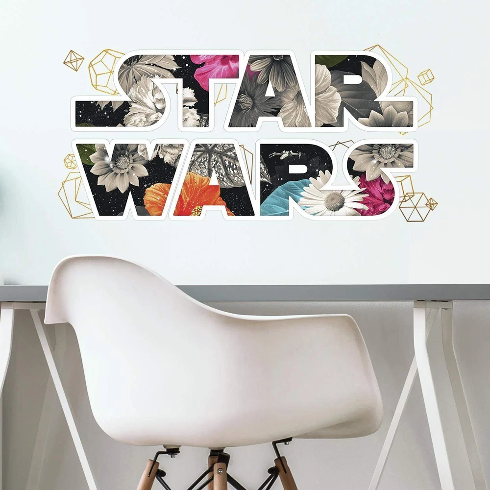 Product Description Give walls a unique transformation with star Wars floral logo peel and stick wall Decals with foil by . An innovative way of decorating any room, this set comes with two larger wall Decals. Make walls pop in minutes with our fast and easy application process – just peel and stick. Created with high quality vinyl, remove and reposition as often as needed leaving walls free of sticky residue. Watch your room transform with . From the Manufacturer Since 2006, , the world’s largest manufacturer of peel and stick decorative products, has enabled consumers across the globe to transform their walls and other room accessories quickly, effortlessly and affordably. offers the largest, most varied (and we like to think “coolest”) selection of Wall Decals and Peel & Stick Wallpapers that install, reposition and remove in seconds without ever leaving any sticky residue or damage to the surface. Our Peel & Stick StickTiles™ enable you to create a backsplash in minutes giving you the opportunity for a fun, fast, easy and always great-looking room/accessory make-over. Just Peel, Stick… Done! Turn an ordinary space, furniture or accessory into anything but ordinary with . Made in the USA Comes with 2 wall Decals; assembled size 34.6 inch wide x 16.5 inch high Easy to apply - just peel and stick Applies to any smooth surface Decals are removable and repositionable with no sticky residue