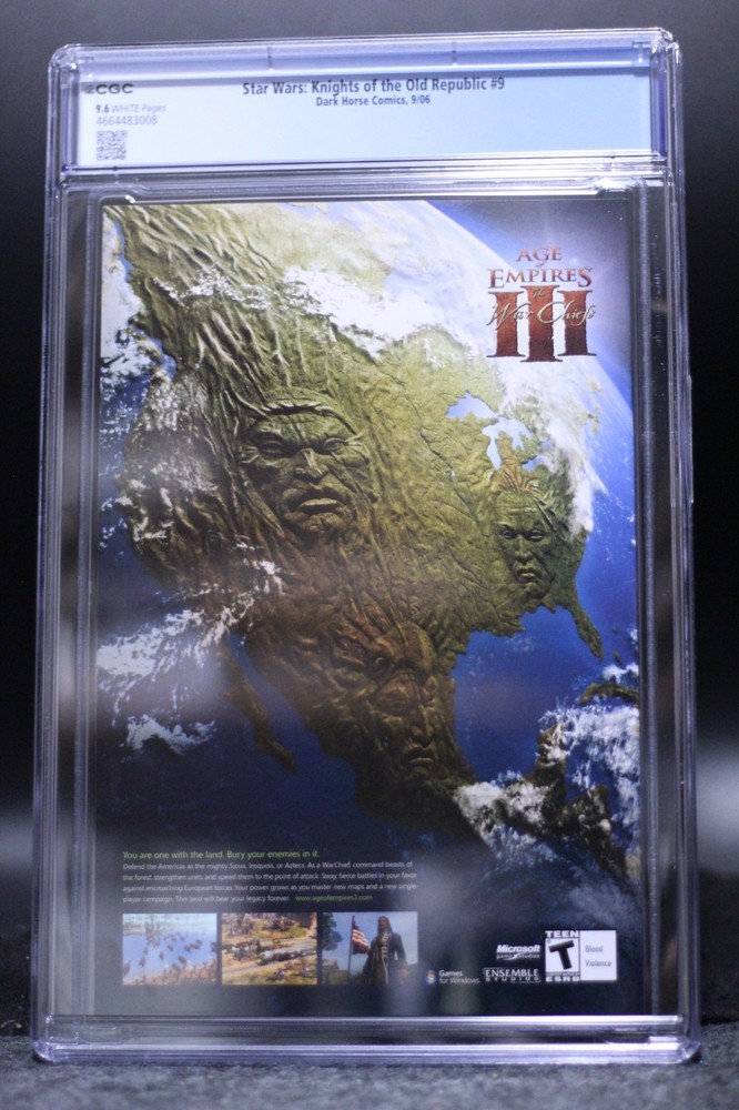 Link to our BEST items!! Link to our ENDING items!! Link to our FAQ page !! Link to our NEWEST items!! Item: Star Wars Knights of the Old Republic (2006) #9 CGC 9.6 WH Pages 1st Darth Revan Special Notes: This issue is a First Printing! We do not use stock photos! What you see in the pictures is what you will be getting. Publication Date: Sept 2006 (The date in the title refers to the year the title started) Writer: John Jackson Miller Interior Artist: Brian Ching Cover Artist: Brian Ching Condition: CGC 9.6 Near Mint + Page Quality: White Pages Bar Code: 4664483008 SHIPPING: All pricing is based on the weight of the package and your location. Package Weight: 3 lb[s] Package Size: 14x12x6 We charge exact shipping costs per USPS with NO handling charge. You can check our shipping quotes on the USPS website. For the convenience of the winner, we offer shipment via Priority Mail or Media Mail, when shipping to an address inside the USA. For International Winners, we offer Priority Mail International or First-Class International Mail. Please click on the "SHIPMENTS and PAYMENTS" tab above for more details. * FREE Insurance, for items totaling under $100.00, is only available when shipping with USPS Priority to an address within in the USA! All packages will have a tracking number sent to the winner! Shipping & Payment Terms: If you would like to have your item insured, please contact us and we will send you an invoice with the adjusted shipping charges. We will be happy to combine the shipping charge for multiple auction wins . If you win a single item, you do not have to wait for an invoice to make your payment. IF YOU WIN MULTIPLE AUCTIONS, PLEASE WAIT UNTIL WE SEND YOU A COMBINED INVOICE BEFORE PAYING FOR YOUR ITEMS. Please DO NOT pay for items separately. We will ship your items within 2 business days upon receiving your payment. Payment Options: PayPal is the preferred method of payment per eBay's policies. If you do not have a PayPal account, we do accept credit card payments over the phone. Payment MUST be received within 7 business days of the auction ending or your bid will be cancelled and eBay will be contacted. Questions: We will be happy to answer any questions you have about our items before the auction ends. Please ask your questions as early as possible so we have plenty of time to answer them. Return Policy: All returns MUST be approved by Duncanville Bookstore. If there is a problem with your order, please give us a chance to address the issue before you leave negative feedback and/or contact PayPal for a refund. Store Info: Please check our other auctions and our eBay store for more great deals!! Check out our info page for more great ways to get in touch with us. Also, feel free to contact us if you are looking for anything in particular or you are looking to sell your items. We are always buying!! Duncanville Bookstore is open 7 Days a Week 10am-7pm CST!!
