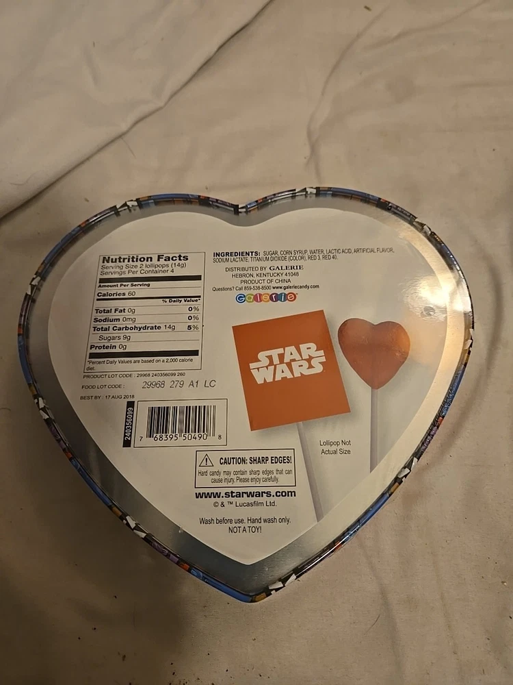 Theme: star wars Country/Region of Manufacture: China Type: Card Stock Occasion: Valentine's Day Franchise: Star Wars Shape: Heart Set Includes: Cards, Candy gtin13: 768395504908 Character: Rey Brand: Galerie Number of Items: 8 Vintage: Yes UPC: 768395504908 Year Manufactured: 2018