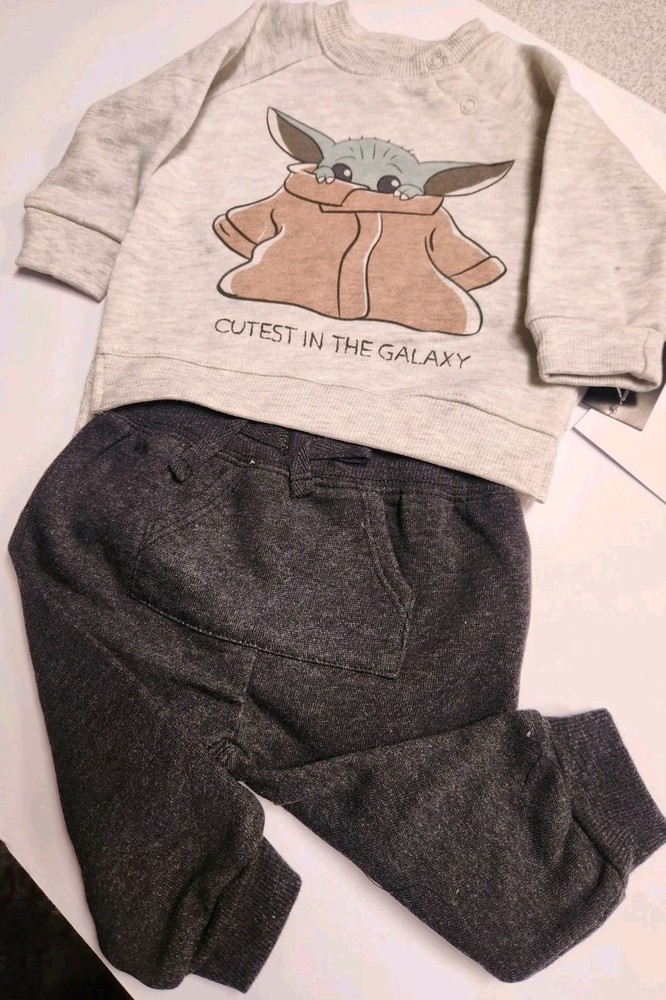 Dress your little one in style with this two-piece outfit set from the Star Wars brand. The set includes a sweatshirt and sweat pants in oatmeal top and dark grey bottom. The sweatshirt features a mandolin character print and comes with a 2 snap closure for easy dressing. The pants have pockets. This outfit set is perfect for travel, activewear, party, or casual occasions. Made of a cotton/polyester knit fabric, this outfit set is machine washable for easy care. It is suitable for boys in size 0-3 months and is appropriate for all seasons - winter, summer, fall, and spring. The set is part of the Star Wars character family and has a solid pattern.