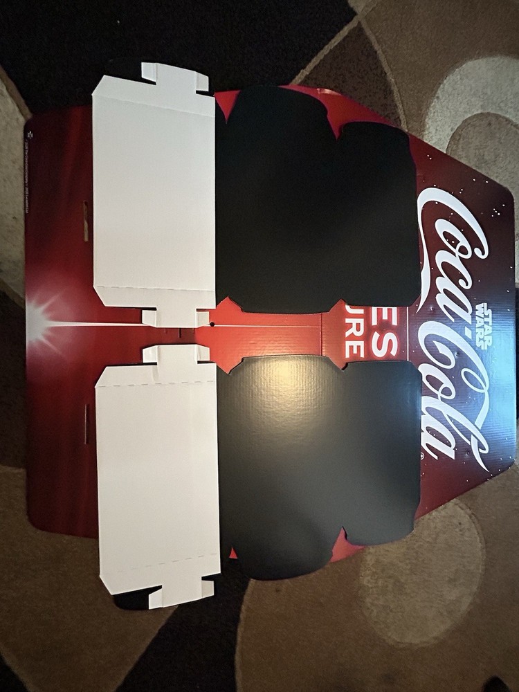 SIZE!!!!! Back Piece L: 46 inches W: 43 inches Mini Cans L: 19.5 inches W: 28.5 inches This is the full set cardboard signage of the collaboration between Coca Cola and Star Wars, Project Solo. Great for collectors and avid fans, this is a LIMITED TIME PROMO that will be concluding very soon. These pieces will be extremely hard to come across in the next couple months. The mini cans have flaps on the backside, that allow the cans to be inserted into the opening of the giant back piece, giving a 3D affect. Hang the huge piece on a wall, and the mini cans will perfectly fit and hang onto the back piece. The back flaps (top and bottom) of the cans need to be folded down, to insert into the slot, so it opens up and the back flap catches into place. Refer to photos for a better understanding! The quality of this piece is pretty good, I’d give it a solid 8/10. The giant back piece has been folded in half (due to being torn down from the stores) and the backsides has slight tape tear marks, from where the tape/adhesive was sticking. Over looking that, this is an incredible collector piece, that will not be made again. The back piece is supposed to have LEDS in the wording, but this certain signage one didn’t have the working LEDS. Price adjusted due to the LEDs not working.