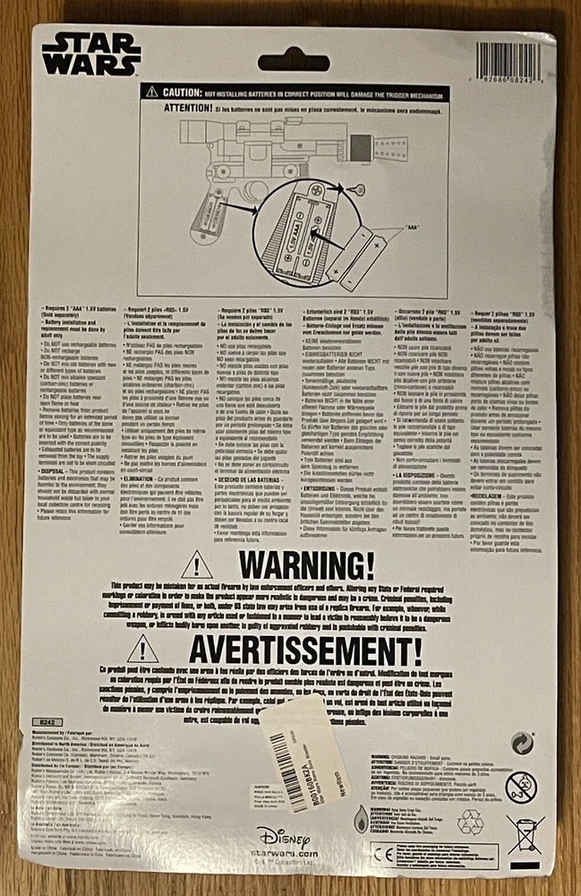 Get ready for a blast from the past with this Han Solo Blaster from Disney/Star Wars made by Rubie's Costume Co. in 2018. New & Sealed package. tThis collectible toy is perfect for any Star Wars fan. This plastic toy is 12” long (package is 16” x 10”) & designed with a white and orange color scheme, and is a fairly good life size replication of Han Solo's iconic blaster from the Star Wars franchise. Perfect to add to your Han Solo Halloween Costume this year or to just have as a Star Wars fan. This blaster is made in the USA and is a part of an official Disney/Star Wars product line. Order now to get in time for Trick or Treating! Please view all photos to confirm quality and condition, thanks for looking!