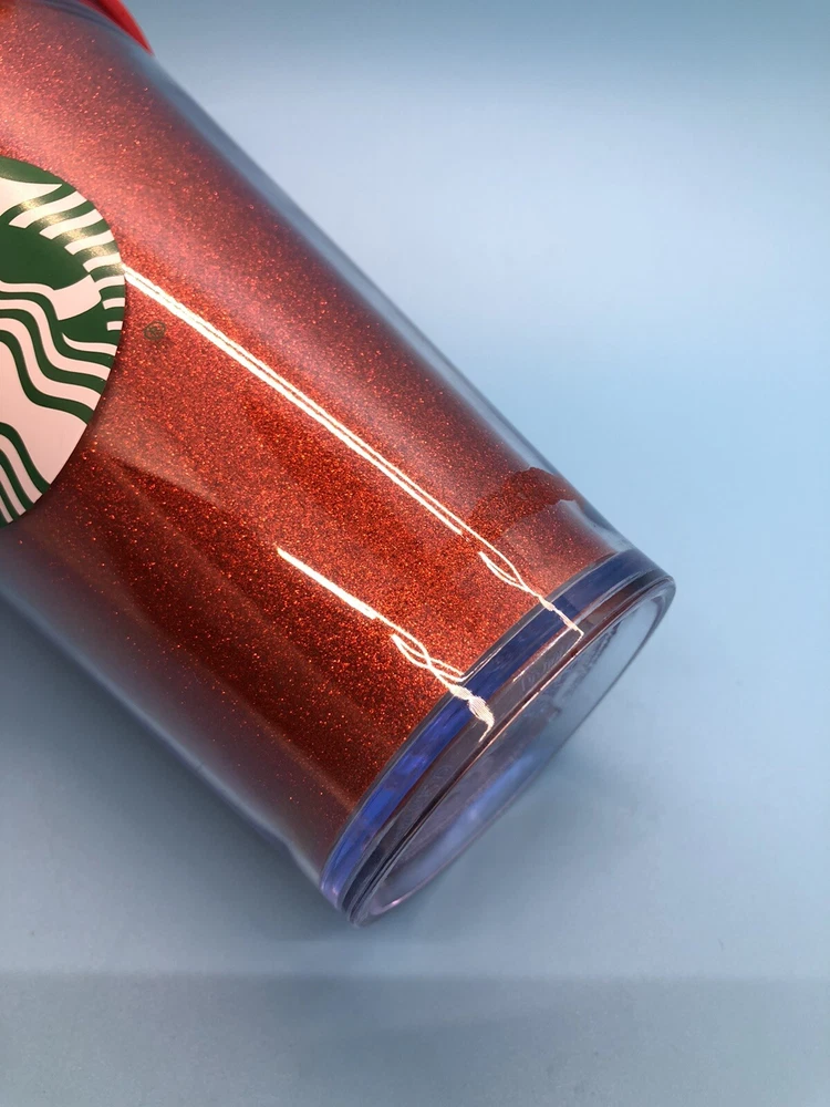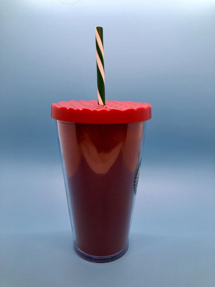 Starbucks 16 oz Ruby Red Sparkly Glitter Holiday Tumbler Waffle Top Green Straw Minor Imperfections Seen In Last Two Photos Please refer to the pictures for the quality and condition of this item, zooming in as necessary. X/4/X/X