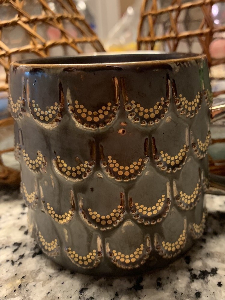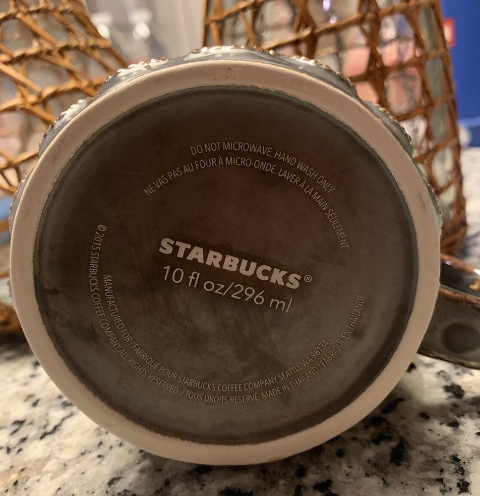 Celebrate Starbucks' 2015 anniversary with this stunning coffee mug featuring a mermaid siren design with 3D gold scales. This collectible mug is perfect for any coffee and tea lover, and Starbucks fanatic. It has a capacity of 10 fl oz and is made in Thailand. The mug is an original piece and is not modified. It is a type of advertising sign with a gold color and features the Starbucks logo. The mug is ideal for collectors and makes a great gift. Get this unique and beautiful mug to add to your collection or to give to a loved one.