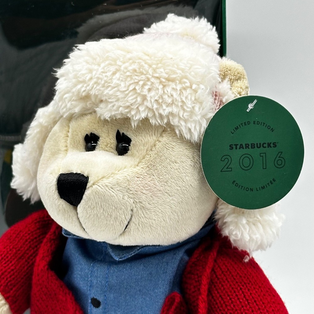 These bears aren’t just for cuddling; they’re a fashion icon. Dressed in chic printed sweaters, these bears are ready to hibernate in style. And let's not forget the hat, because even bears know winter is coming. You're not just buying a bear; you're adopting a legend. • Limited Edition 2016 • Faux Fur Hat & Boots • Starbucks Collectible • Approx. 12 Inches Tall New in boxes