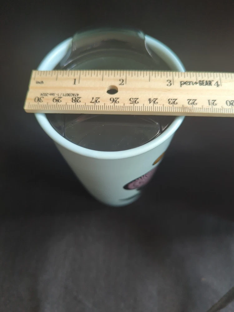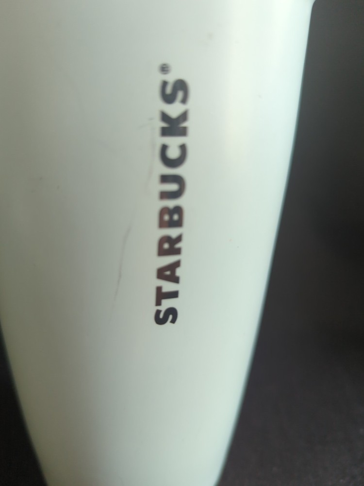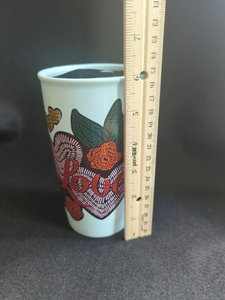 This Starbucks 2019 "Love" Ceramic Travel Mug was released in 2019 by Starbucks for Valentine's Day. It has a light blue background with the word "Love" and a heart and flower design in a stitched pattern. It is in "Very good" used condition, with a faint mark near the Starbucks logo. It holds 12 ounces of hot or cold liquids. It is 6 inches tall x 3 1/2 inches in diameter. Please let me know if you have any questions or would like some additional photos.