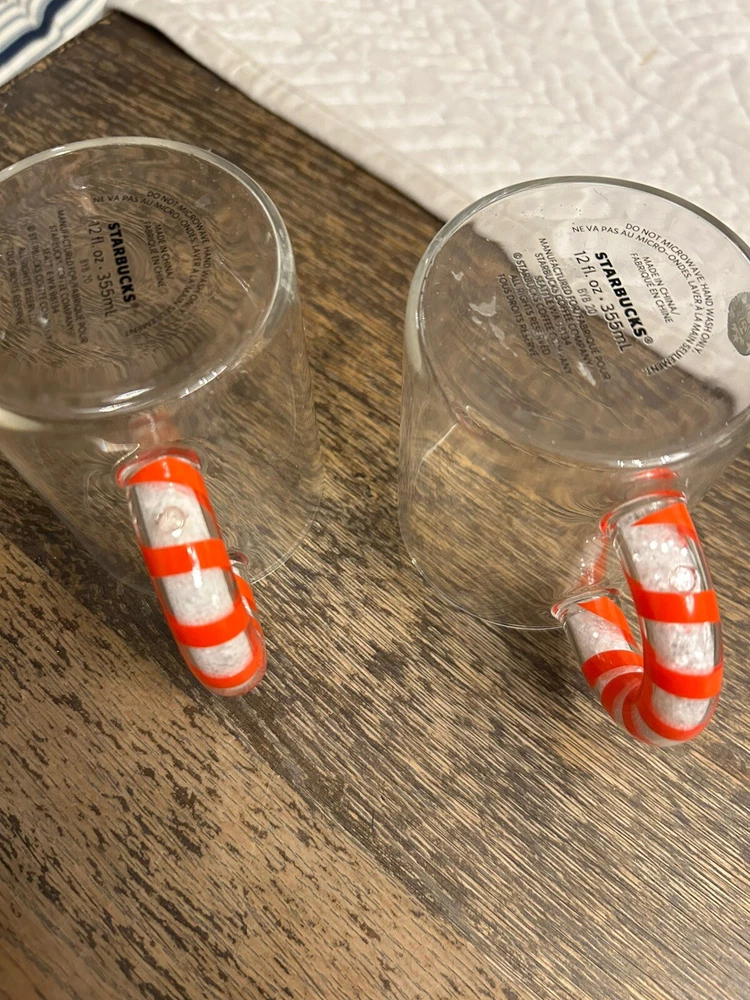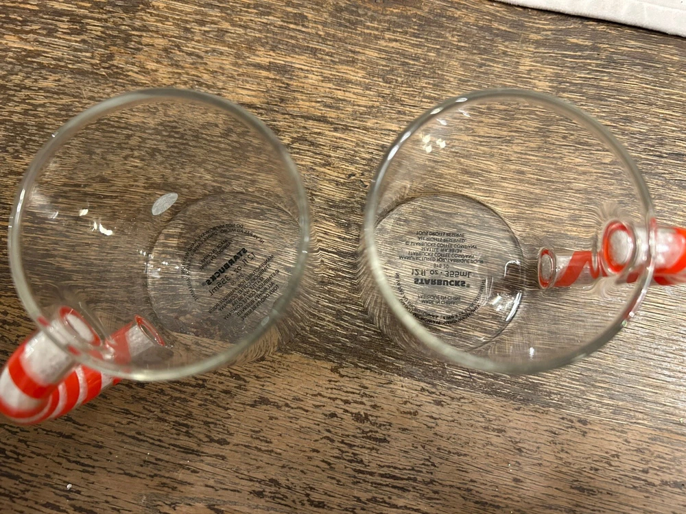 Get into the holiday spirit with this set of two Starbucks coffee cup mugs. Featuring a glittery candy cane design on clear glass. 12 oz mugs in new condition.