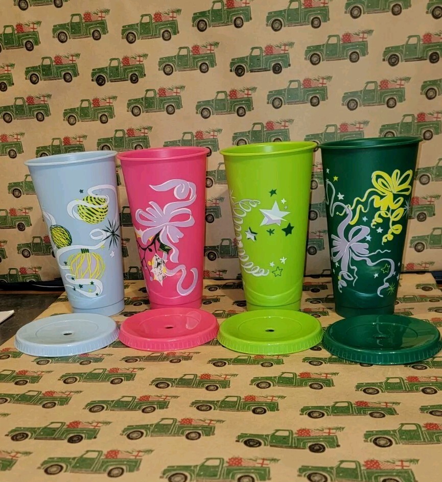 The Starbucks Christmas Cup Set includes four 24 oz cold beverage cups featuring a festive design perfect for the holiday season. The cups are original Starbucks merchandise, making them a unique collectible item for fans of the brand. With a multi-color theme and a focus on coffee and tea, these cups are ideal for enjoying your favorite Starbucks drinks in style during the Christmas season.