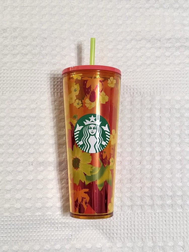 Color: Orange Brand: Starbucks Style: Modern Glassware Type: Tumbler Character Family: Starbucks Type: Tumbler Theme: Coffee & Tea Capacity: 24 oz Number of Items in Set: Three-Piece Features: With Lid, With Straw Shape: Tapered Pattern: Floral Material: Plastic Occasion: All Occasions, Fall, Spring, Summer, Winter Department: Teens, Adults Character: Mermaid Set Includes: Cup Lid, Straw, Tumbler