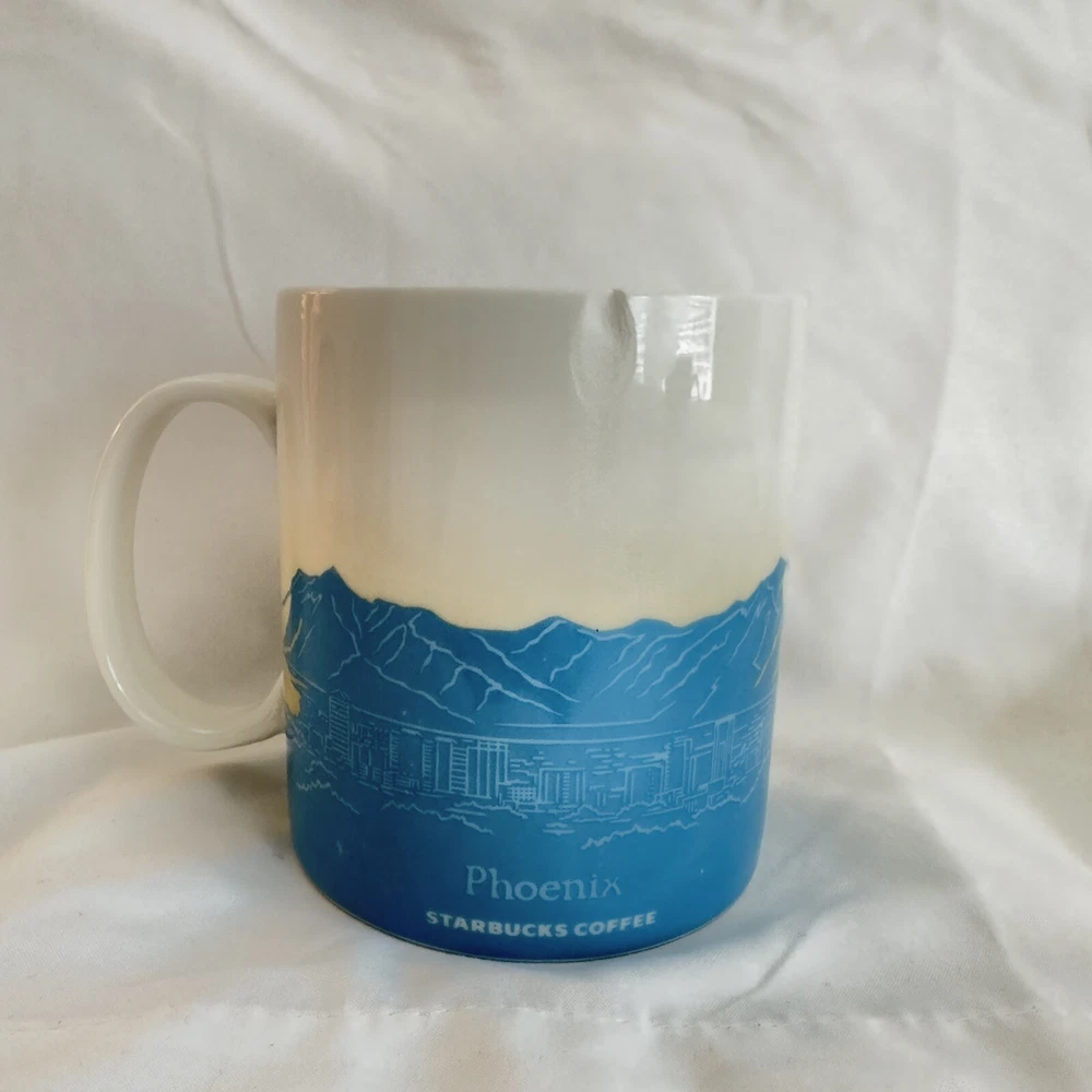 The product is a Starbucks "Been There" mug featuring the city of Phoenix. This collectible mug is part of Starbucks' popular collection that showcases various cities around the world. As a themed coffee and tea item, it is designed for coffee enthusiasts and collectors alike. The mug likely features unique and iconic landmarks and symbols representing Phoenix, making it a sought-after item for Starbucks fans and those looking to commemorate their travels to the city.