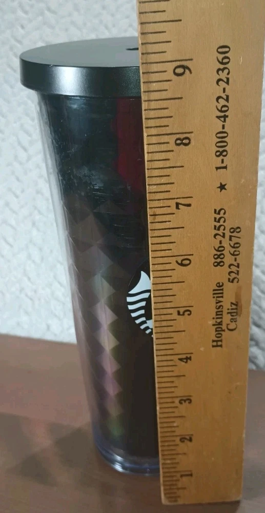 Add some sparkle to your morning coffee routine with this stunning Starbucks Black Diamond Studded Tumbler. The dark bling color and coffee & tea theme make it the perfect addition to any Starbucks collection. This original 2016 acrylic plastic cold cup was crafted in China and features the iconic Starbucks brand. Perfect for collectors or anyone who loves a little extra glam in their morning routine, this venti tumbler is sure to impress. The featured refinements of cold cup and Starbucks make it a must-have for any coffee lover. Don't miss out on the chance to add this stunning piece to your collection.