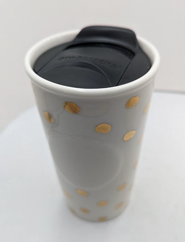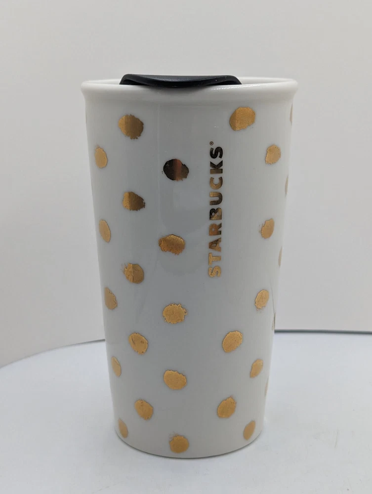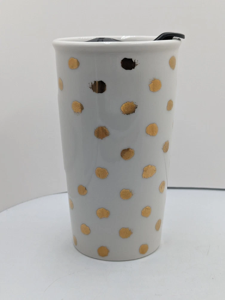 Starbucks Ceramic 2014 Gold Polka Dot Collection Travel Mug Tumbler w Lid 10 oz. Very nice pre-owned condition with no damage. I think the original lid was white and since this one is black, I believe it may be a replacement but this is the way it was purchased and it fits perfectly. This mug is double walled to keep your beverage hot longer. All of my items are carefully packed for shipping, no matter their value - $5 items are wrapped with the same care as a $200 item. My goal is to have your purchase arrive safely. I use recycled packaging when possible but mostly use new, high quality products so your item will arrive intact without damage. Large, heavy and fragile items are harder to use combined shipping with but just ask if you would like to purchase more than one item and I am more than happy to do so if feasible. If not, maybe we can work out a shipping discount. Thank you and hopefully you will visit my store again!