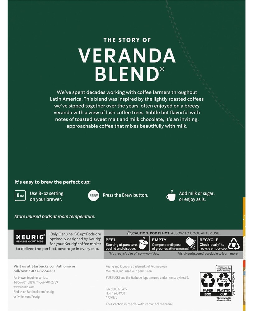 Starbucks Coffee K-Cup Pods, Veranda Blend, Blonde Roast 72 Count (Pack of 3) Description Starbucks Veranda Blend Ground Coffee, Blonde Roast (72 K-Cups) Features: Product Details: Handling We will ship all orders within 1 business day of payment. Delivery We Do Not Ship Outside of the Continental US. Return Policy All items qualify for returns within 30 days of receipt. Buyer is responsible for return shipping on any item that is not damaged. Feedback We take our reputation seriously, we buy and sell online, so we understand the value of trust. If you are unsatisfied with your order, please contact us and we will work with you to resolve it to your satisfaction.
