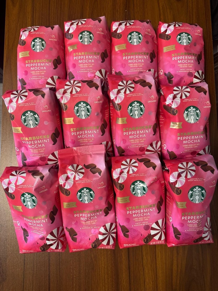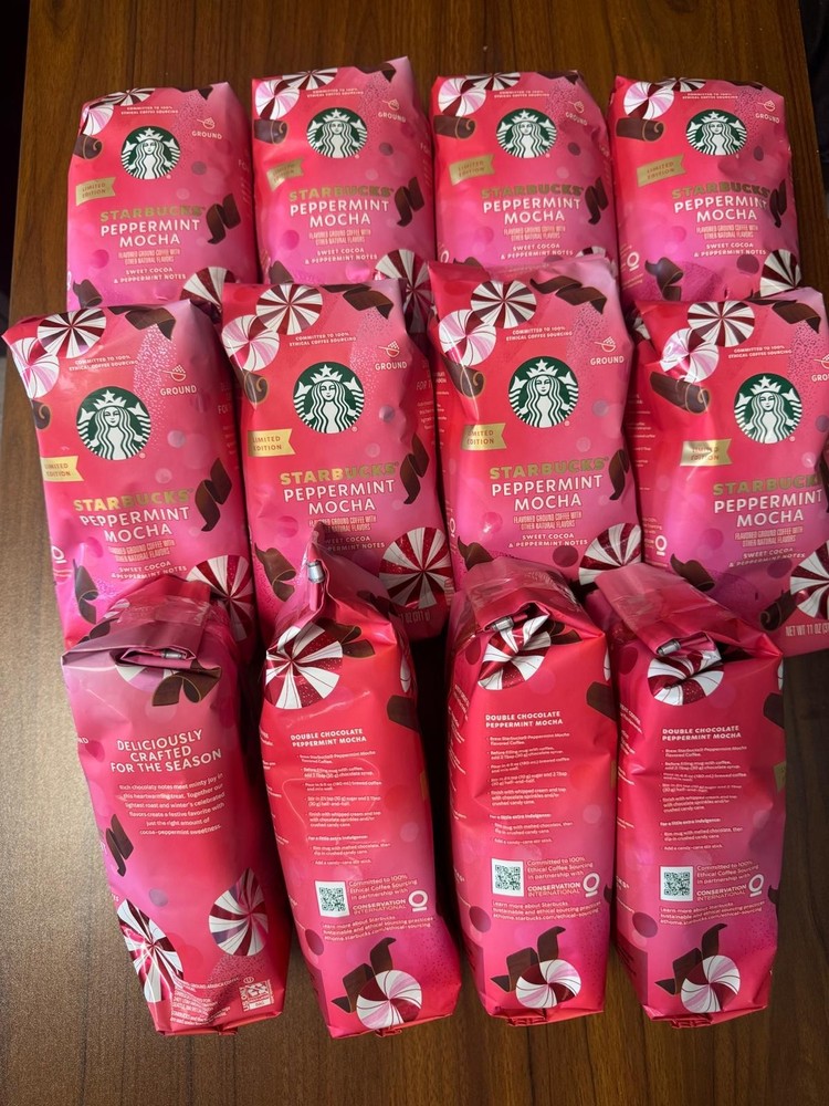 The product is Starbucks Coffee Peppermint Mocha Ground Light Roast, with an expiration date of 04/25/2026. This medium roast coffee features a peppermint mocha flavor and is dairy-free, egg-free, gluten-free, and kosher. It is limited edition, organic, and fairtrade. Each bag contains 11 oz of coffee grounds, making it perfect for brewing a festive and flavorful holiday drink. Made in the United States, this product is ideal for those who enjoy a classic peppermint mocha coffee blend.