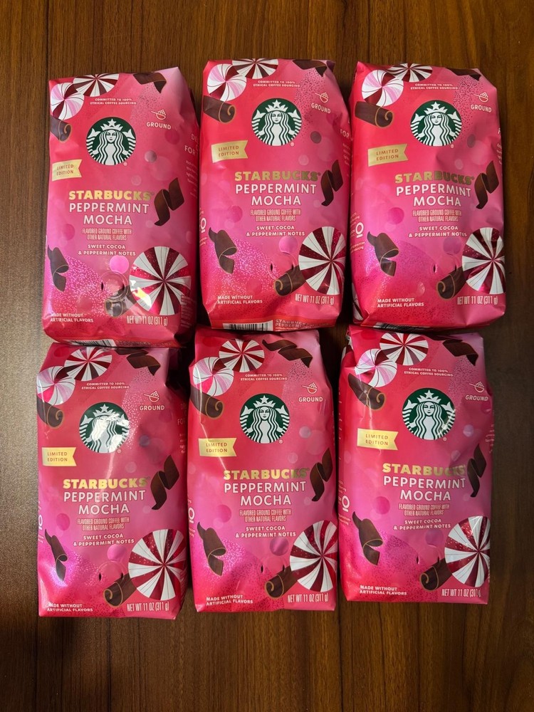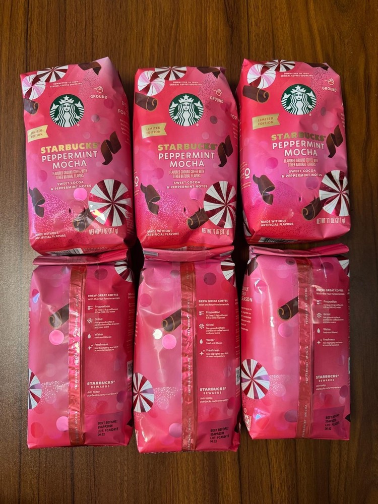 6 PACK The product is Starbucks Coffee Peppermint Mocha Ground Light Roast, a limited edition flavored ground coffee with a peppermint and chocolate flavor profile. It is dairy free, egg free, and gluten free, making it suitable for various dietary restrictions. This Fairtrade coffee is certified organic and has no artificial flavoring or coloring, featuring natural flavors instead. With an expiration date of 04/25/2026, each pack includes 6 bags of 11 oz each, perfect for holiday gatherings or everyday enjoyment. Made in the United States, this coffee offers a festive and cozy drinking experience.