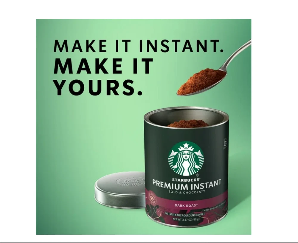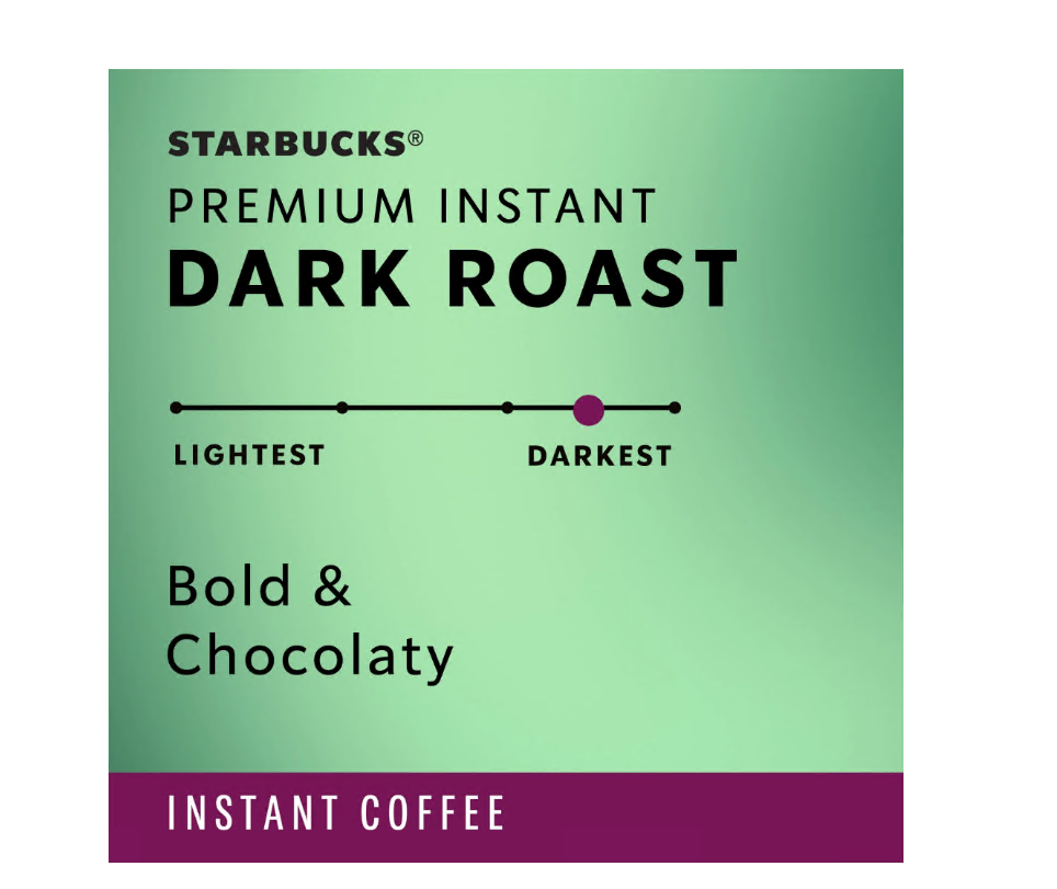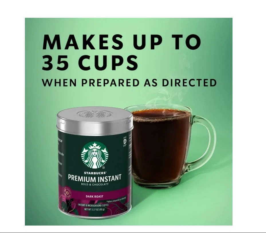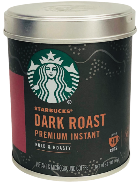 Starbucks Premium Dark Roast Instant Coffee, 3.17 oz FAST FREE SHIPPING IN USA FEATURES PREMIUM INSTANT COFFEE: Starbucks Dark Roast Premium Instant Coffee is crafted with the same high-quality 100% arabica beans we brew in our cafés, and it makes up to 35 cups BOLD & CHOCOLATY: Starbucks Dark Roast coffee has a sweet, roasty flavor with delicious notes of dark chocolate MADE TO BE YOURS: Starbucks Premium Instant Coffee lets you adjust how much coffee you add, so you can stir up Starbucks coffee just the way you like in an instant