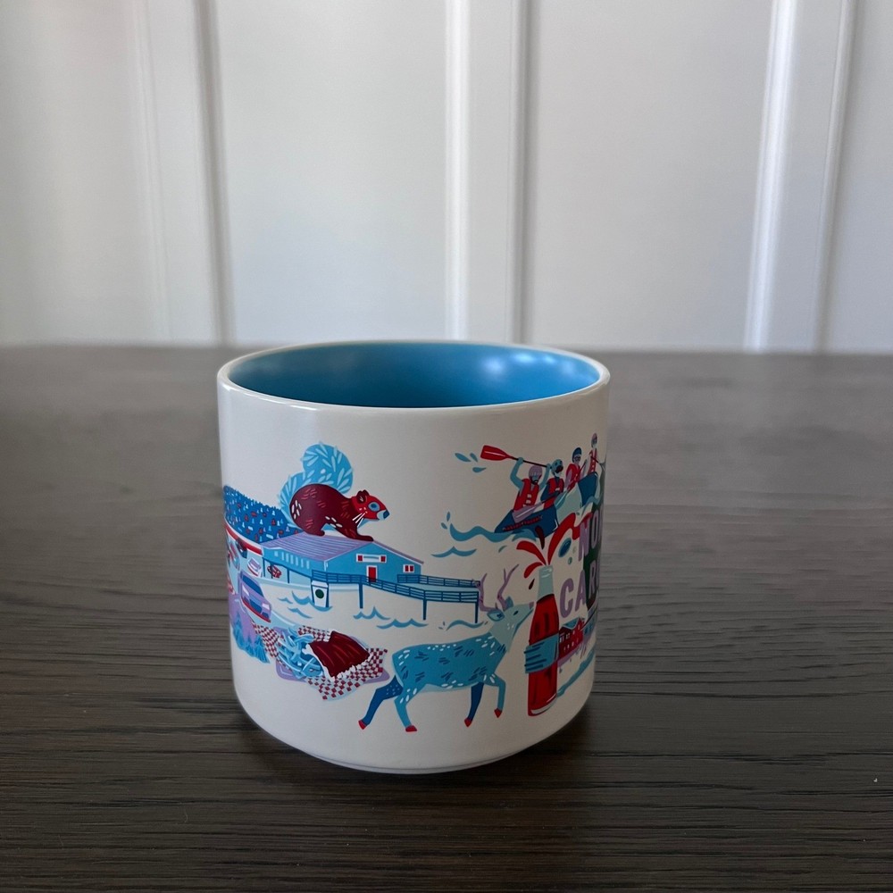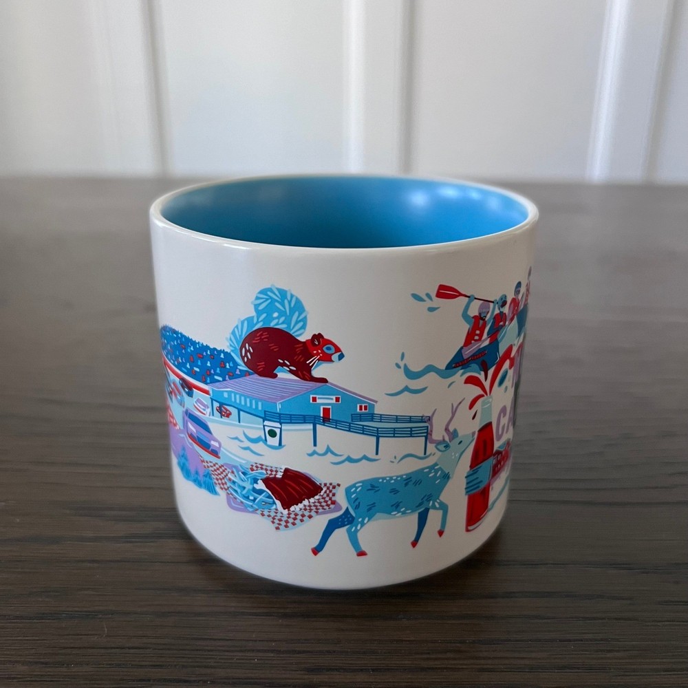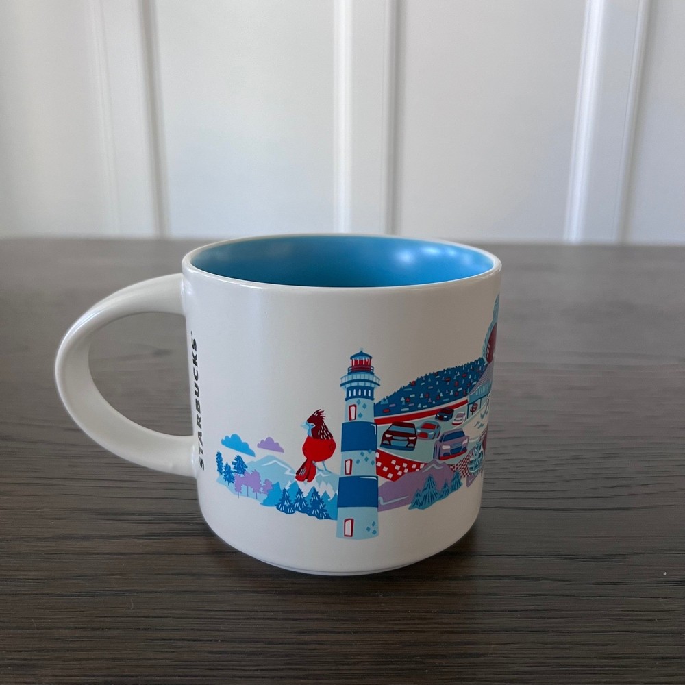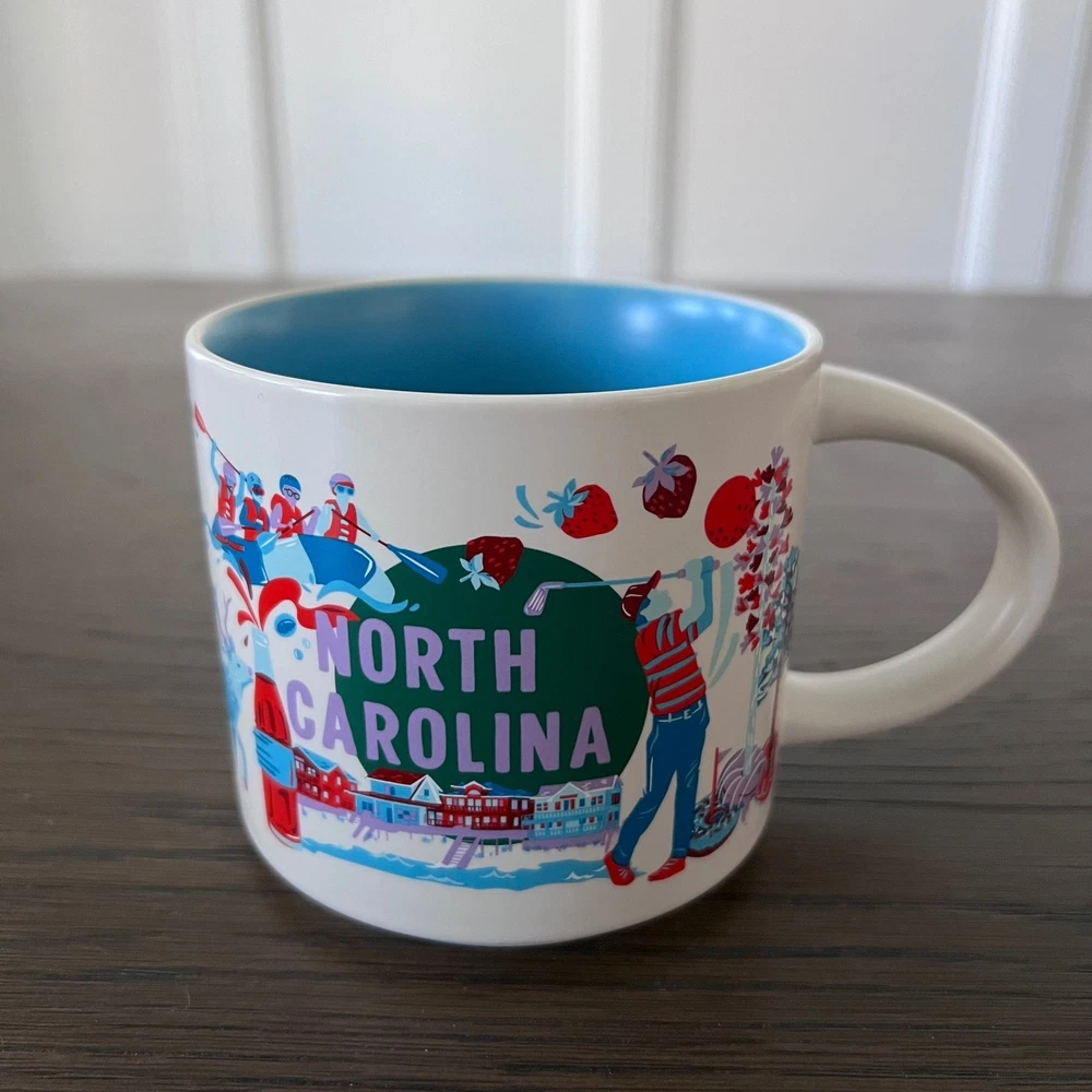 Starbucks Discovery Series mug celebrating North Carolina. This ceramic coffee cup features vibrant illustrations depicting iconic scenes and activities from the state, including lighthouses, kayaking, golf, and local wildlife, all set against a backdrop of rolling hills and coastal scenery. The interior of the mug is a striking bright blue. Perfect for enjoying your morning coffee or tea, or as a collectible piece for any Starbucks enthusiast. New without original packaging Measurements: • Height: 4.25 in • Diameter (top): 3.75 in • Diameter (bottom): 3.5 in • Handle length: 3 in • Capacity: 14 fl oz / 414 mL Type: Coffee Mug Set Includes: Mug Theme: Letters, Numbers & Words, Nature Print, Wild Animals, Signs & Symbols, Mixed Themes Pattern: Pictorial Material: Ceramic Occasion: All Occasions Service For: 1 Features: Microwave Safe, Dishwasher Safe, Decorated, Suitable for Hot Beverages Capacity: 14 fl oz Shape: Straight Keywords: Starbucks mug, Discovery Series, North Carolina, coffee cup, tea mug, collectible, travel mug, souvenir, kitchenware, gift idea, blue interior, ceramic mug, state Check out my store for other great finds. See my other listings!
