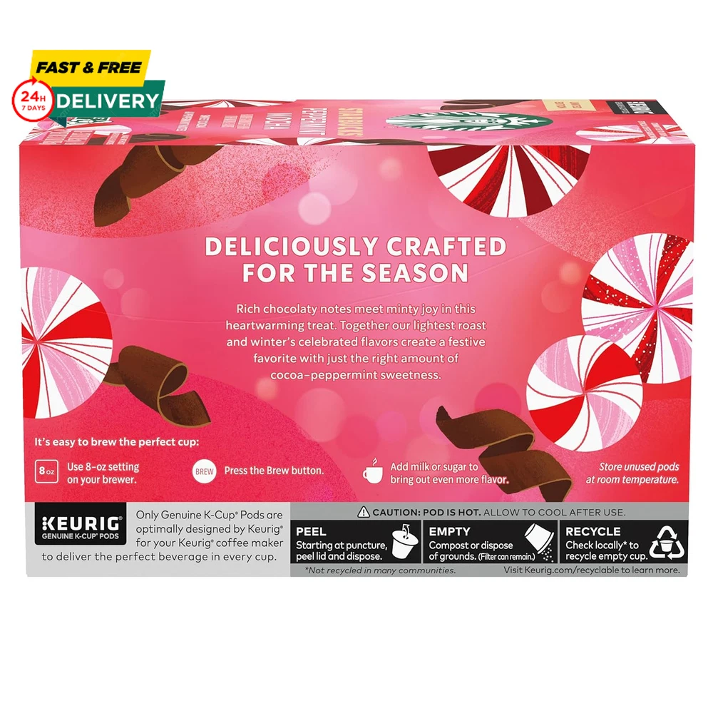 Menu Other Items Feedbacks About Us Contact Us Add To Favorites Starbucks Flavored K-Cup Coffee Pods — Peppermint Mocha for Keurig Brewers — 1 Box (10 Pods) PREMIUM COFFEE IN A K-CUP POD: Celebrate the season with Starbucks Peppermint Mocha Naturally Flavored Coffee—this holiday gift brings the tastes of the season home in this box of 10-count K-Cup pods that makes the perfect white elephant gift for adults PEPPERMINT MOCHA NATURALLY FLAVORED COFFEE: Peppermint and mocha swirl together in this festive, naturally flavored coffee that's a must-have for the season CAFÉ QUALITY: Starbucks adheres to the highest quality standards—shipping you the same carefully roasted 100% arabica coffee beans we brew in our cafés LIMITED-TIME EXCLUSIVE: Unwrap limited-edition holiday coffees, like our Starbucks Peppermint Mocha Naturally Flavored Coffee, Starbucks Holiday Blend or Starbucks Gingerbread Naturally Flavored Coffee ETHICALLY SOURCED: We’re committed to offering ethically purchased and responsibly produced sustainable products of the highest quality Celebrate the season with holiday favorites that bring warmth and cheer to your cup. These Starbucks Peppermint Mocha K-Cup Pods are a naturally flavored, heartwarming treat that features rich chocolaty notes and pure minty joy. Together, our lightest roast and winter’s celebrated flavors create a festive sip with just the right amount of sweetness. Whether you like your coffee black or adding a flavorful coffee creamer or coffee syrup, this holiday seasonal is a festive favorite you'll love. Indulge yourself this season or stock up on holiday gifts everyone will love. From ground coffee and whole beans to holiday coffee K-Cup pods and flavored delights, let's be merrier together. But hurry, this limited-edition favorite will be gone before you know it. Nestlé uses Starbucks trademarks under license. Keurig and K-Cup are trademarks of Keurig Green Mountain, Inc., used with permission. Item Specification Roast Level Medium Roast Product Dimensions 4 x 6 x 4 inches; 5.6 ounces Caffeine Content Description Caffeinated Units 60 Count Flavor Mocha,Peppermint Mocha Item Form Pod Brand Ogefine Manufacturer Starbucks Coffee Dimensions Shipping Returns Additional Info Product Dimensions: 6.0 inches x 4.0 inches x 4.0 inches. Weight: 5.6 oz Fast shipping is very important for us. Our standard shipping service is FREE. Your order will be shipped within 1-3 business days upon full payment received. Most items are delivered within 3-5 business days, however, please allow 3-10 business days. We are shipping only to USA. We only ship to the confirmed Paypal address. We reserve the right to cancel any order for any reason at any time. We are not responsible for undeliverable addresses. We offer a 30 day return policy from checkout winning date. Your satisfaction is guaranteed! If for any reason you are unhappy with your item, just return it within 30 days for a full refund, minus shipping cost. Please contact us prior to initiating a return so that we can issue you a refund authorization. Items defective upon receipt must be packaged in their retail packaging as if new and returned with a detailed description of the problem. Return shipping fees are not refundable. We reserve the right to decline any returns if the above guidelines are not followed. All of our items, unless otherwise stated, will only run on 120 volts. Please check to make sure your country complies with these specifications. If you have a problem or question regarding your transaction please contact us before leaving any type of feedback. We will work with you to resolve any problem you may have.