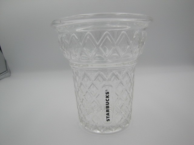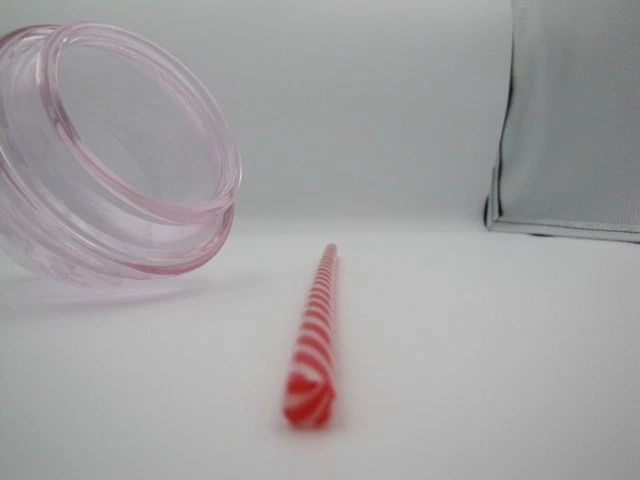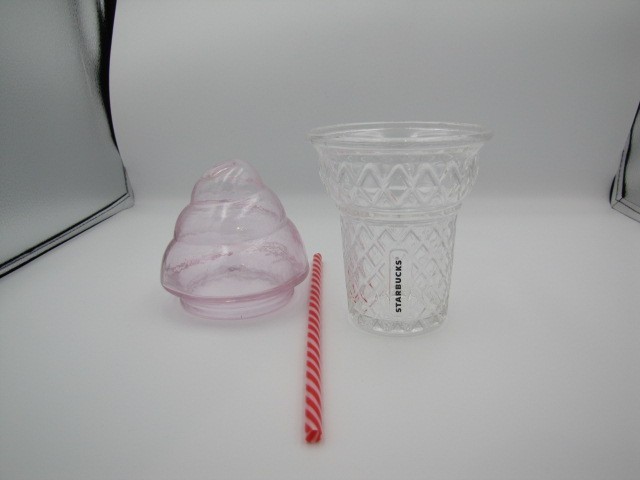 The Starbucks Frappuccino Shaped Glass Cup with a Pink Swirled Lid and Red Striped Straw is a collectible advertising item featuring the popular coffee and tea theme associated with Starbucks. This original piece is manufactured in China, making it a unique and colorful addition to any Starbucks memorabilia collection. The pink color and swirl design on the lid add a touch of flair to this limited edition cup, making it a standout piece for fans of the brand.