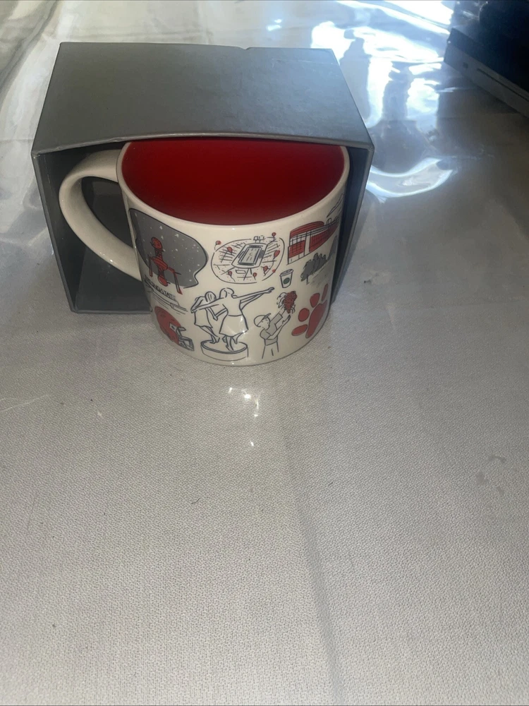 The product is a Starbucks 14oz mug from the Been There Series Campus Collection featuring Fresno State Bulldogs. The mug is multi-color and was created in 2022. It is an original piece of advertising for Fresno State, incorporating a coffee & tea theme. The mug comes in a special box for the collection.