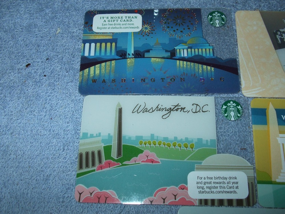 Starbucks Collectible Gift Cards. Washington DC. Set of 5 MINT CONDITION CARDS. No loaded value. Never loaded never swiped. Worldwide shipping. There is a five day ship time on all items if you cannot wait please ask in advance if we were able to ship earlier, items are also shipped from Arizona and Maryland as it is where my partner is we will let you know which location has been shipped fromA friend and I are working this page. We are just selling some of our own items. This is not a business. It is strictly just us cleaning up and making some room. We do have a five day shipping. On our items as we have regular jobs and this is like I said just to get rid of some of our own stuff so please be patient. If you can?t wait to five days for shipping please let us know we will try to accommodate